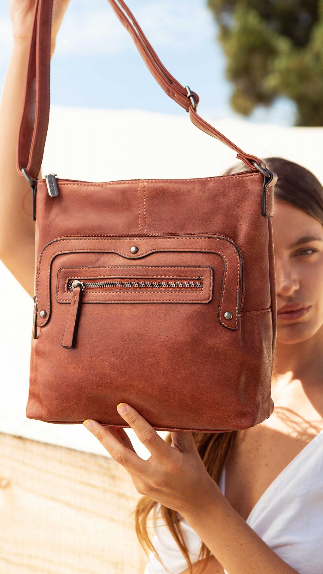 Bandolera en símil cuero con dos bolsillos al frente con cierre. Detalles tachas metálicas.Un bolsillo atrás. Incluye tres bolsillos internos para mayor comodidad.