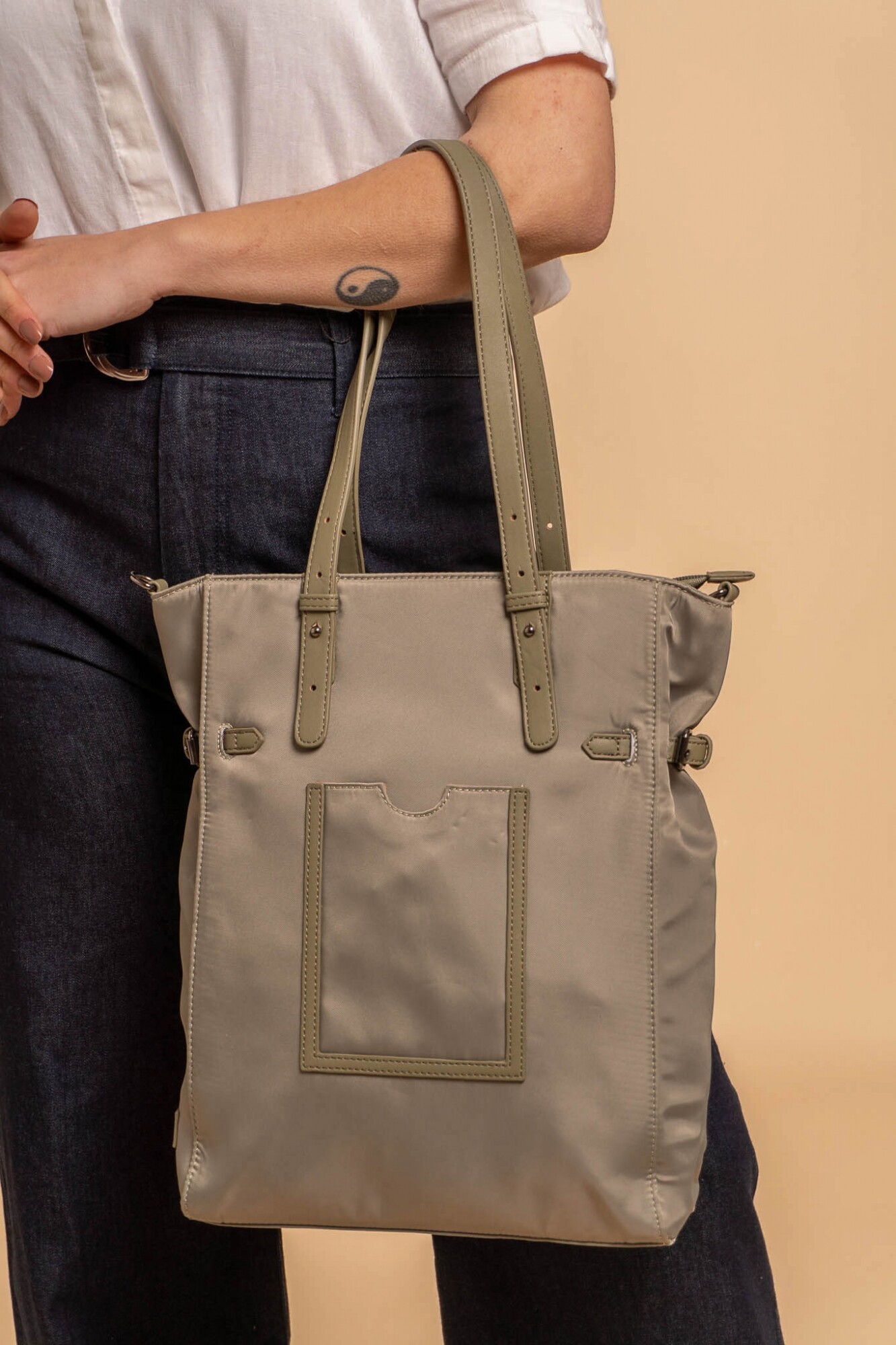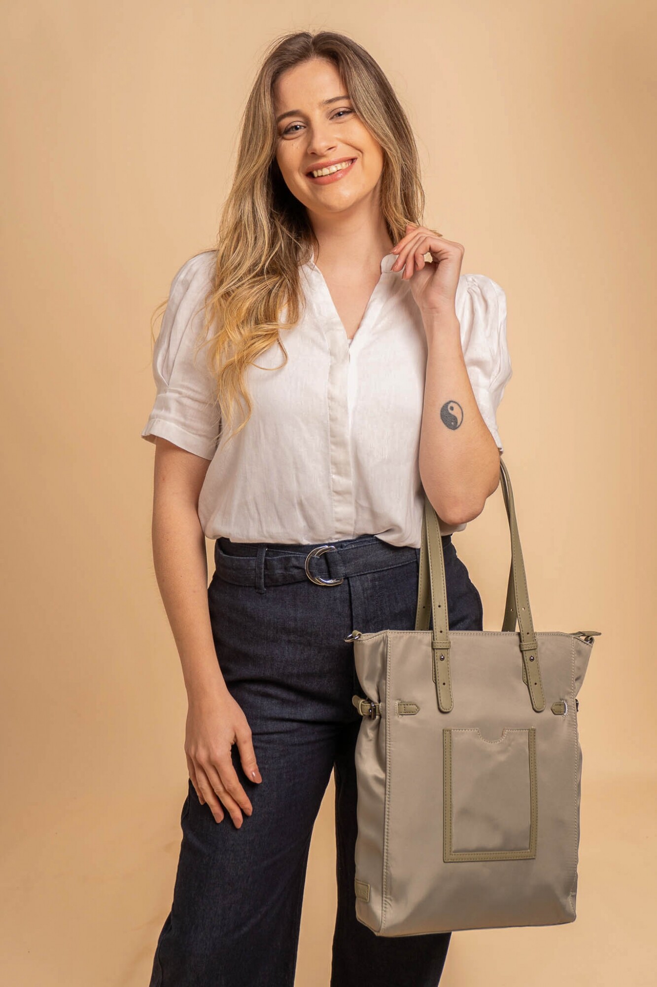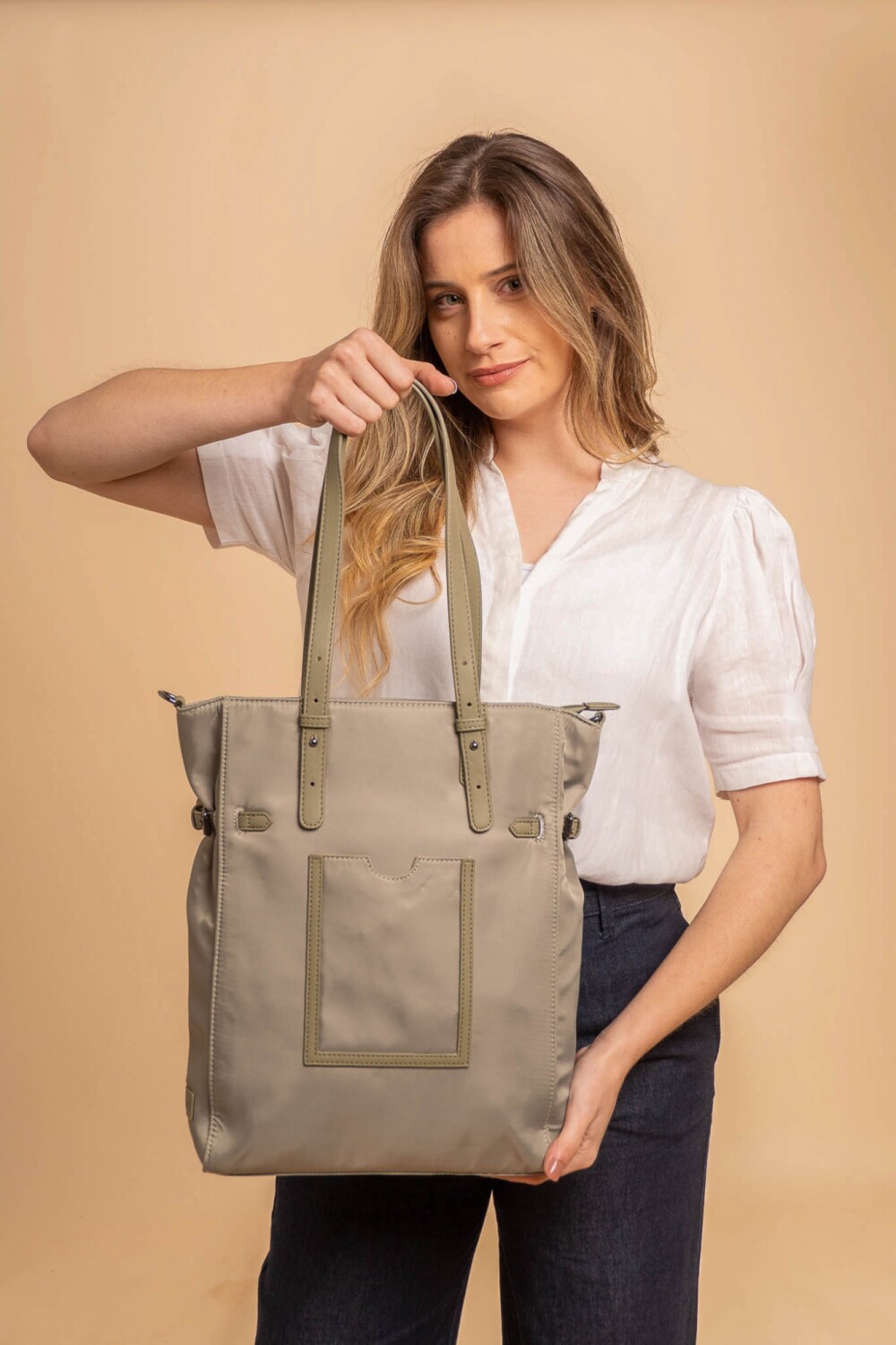 Bandolera elegante. Cuenta con asas dobles, correa ajustable y bolsillo frontal. Ideal para uso diario gracias a su diseño funcional y moderno.
