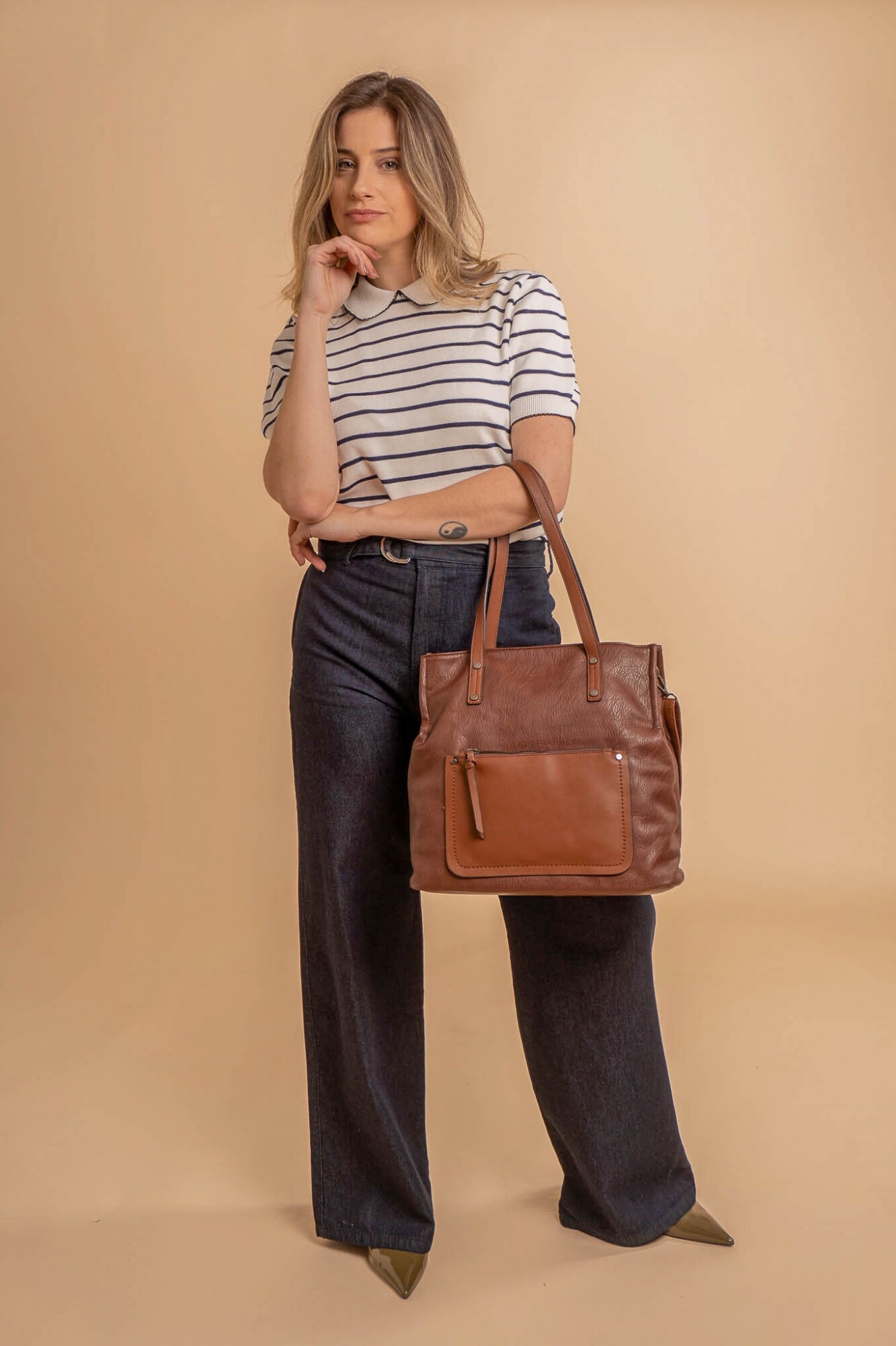 Cartera bandolera grande con dos asas cortas y una correa larga regulable. Cuenta con dos divisiones internas y un bolsillo frontal con cierre. Diseño práctico y elegante, ideal para el uso diario.