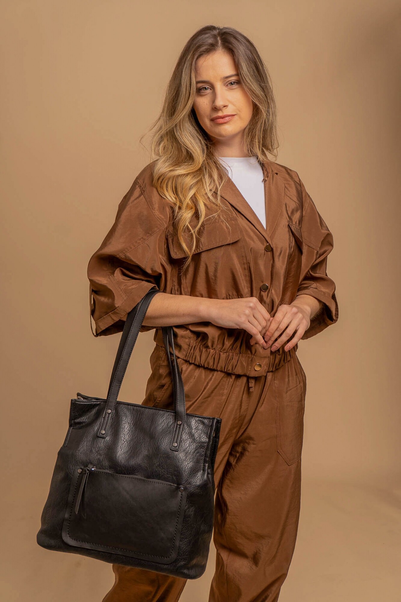 Cartera bandolera grande con dos asas cortas y una correa larga regulable. Cuenta con dos divisiones internas y un bolsillo frontal con cierre. Diseño práctico y elegante, ideal para el uso diario.