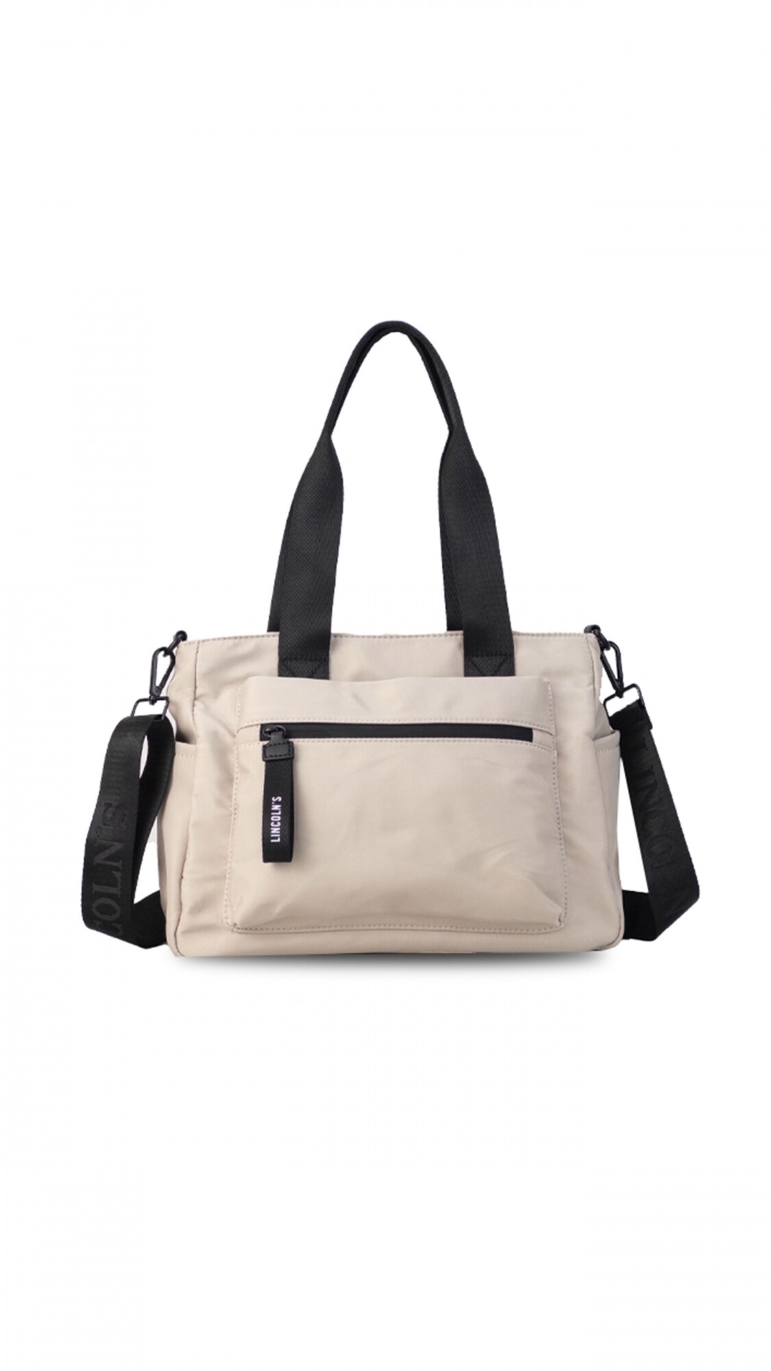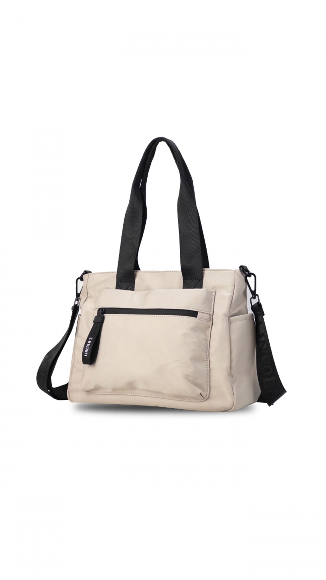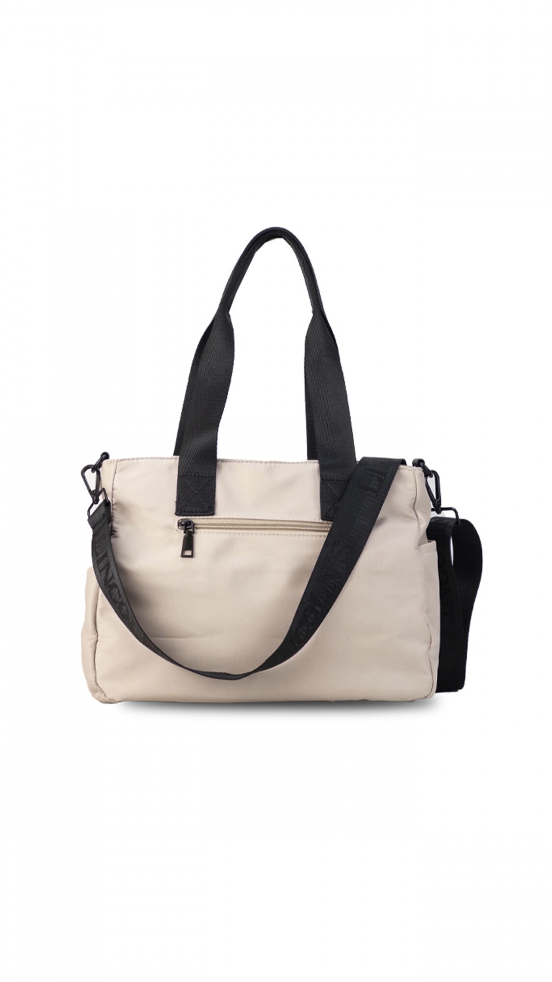 Bandolera con cierre y asa. Cuenta con varios bolsillos externos, tanto en la parte dorsal como en la frontal, ambos con cierre, y laterales abiertos para un acceso rápido. Incluye correa de galón extensible. Ideal para el uso diario.