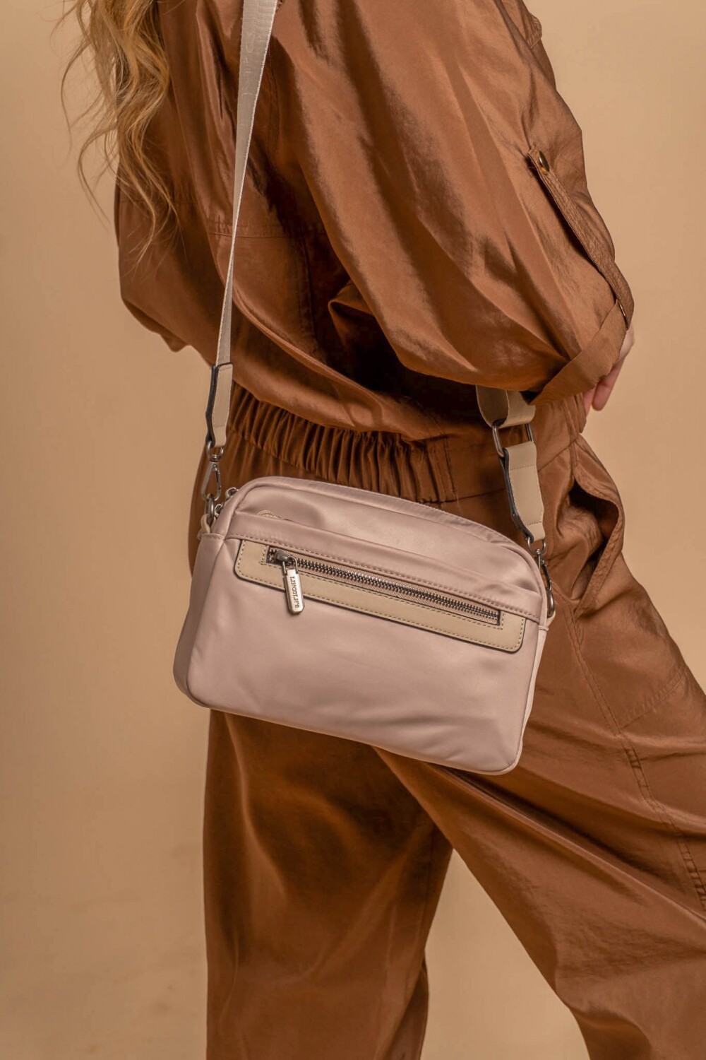 Bandolera , con múltiples cremalleras metálicas, correa ajustable ancha y herrajes plateados. Diseño moderno y funcional.
