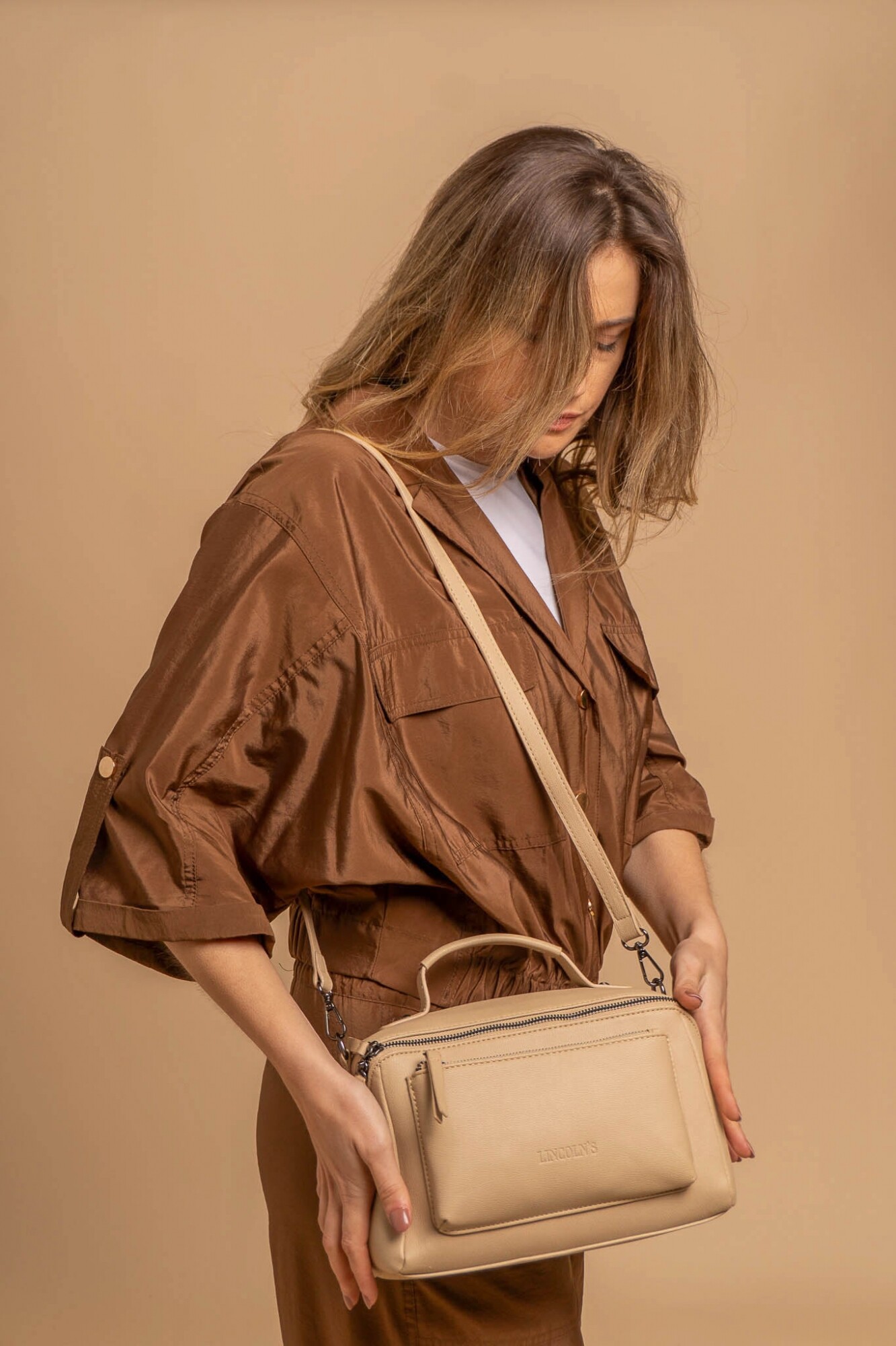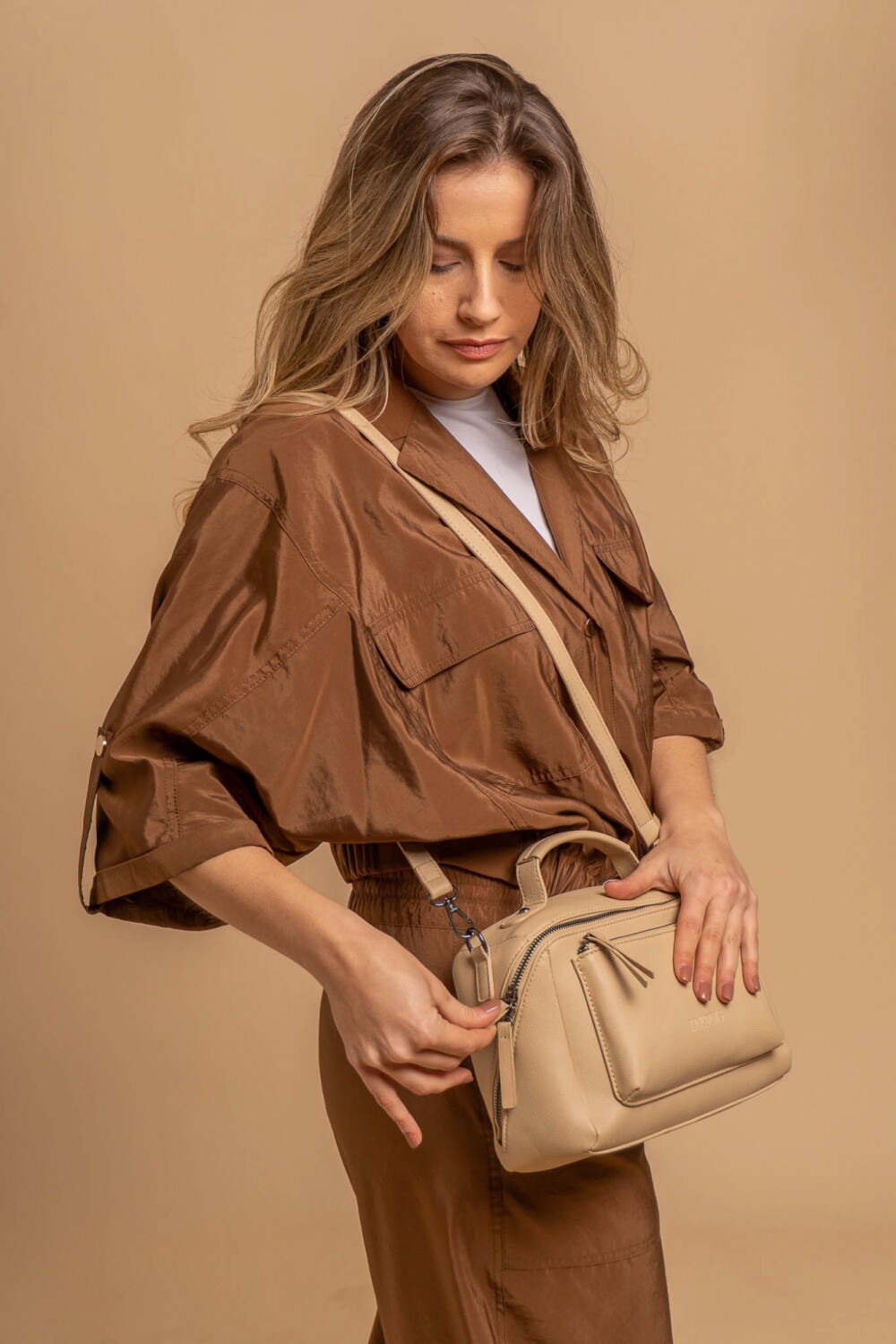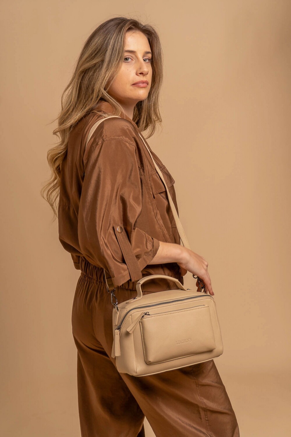 Bandolera con asa superior, y correa larga ajustable. Dos bolsillos frontales, uno de ellos con cierre cruzado generando un diseño práctico y elegante.