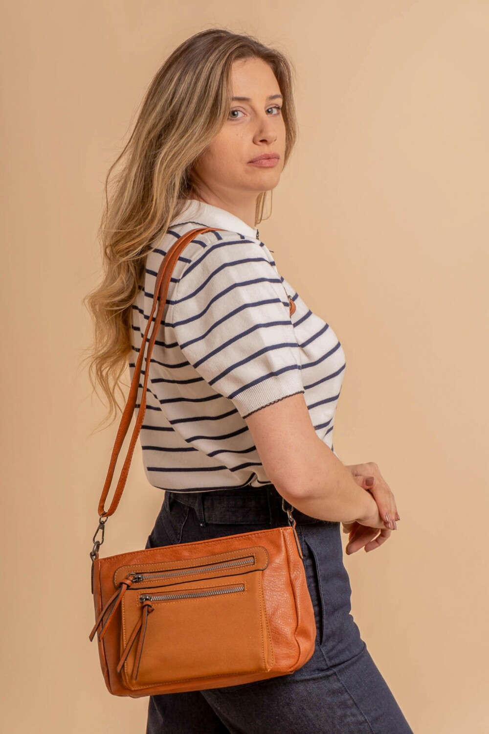 Bandolera en simil cuero con detalles en nobuck. Cuenta con cierre principal, así como cierres adicionales en la parte trasera y delantera para mayor comodidad y seguridad. Diseño práctico y elegante.