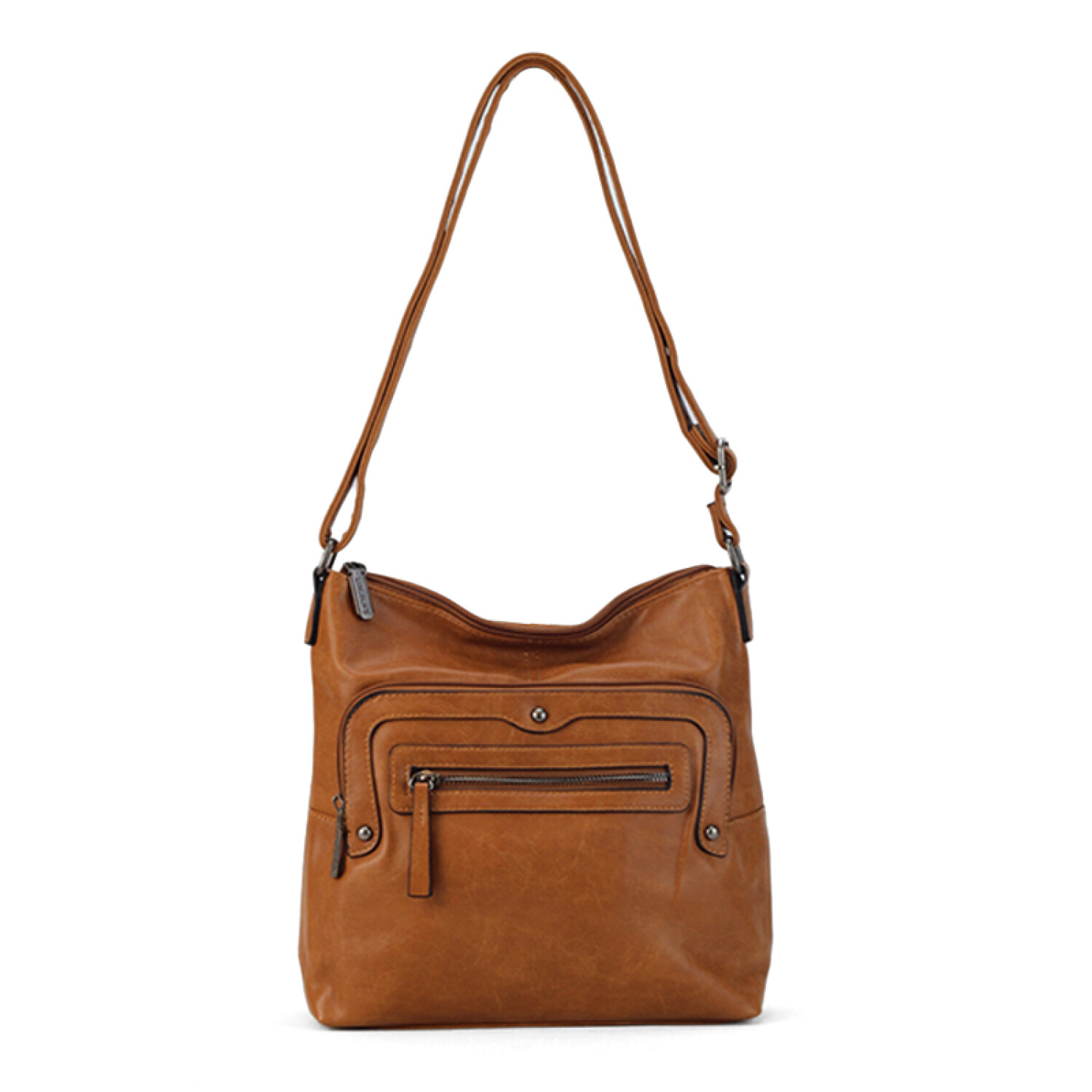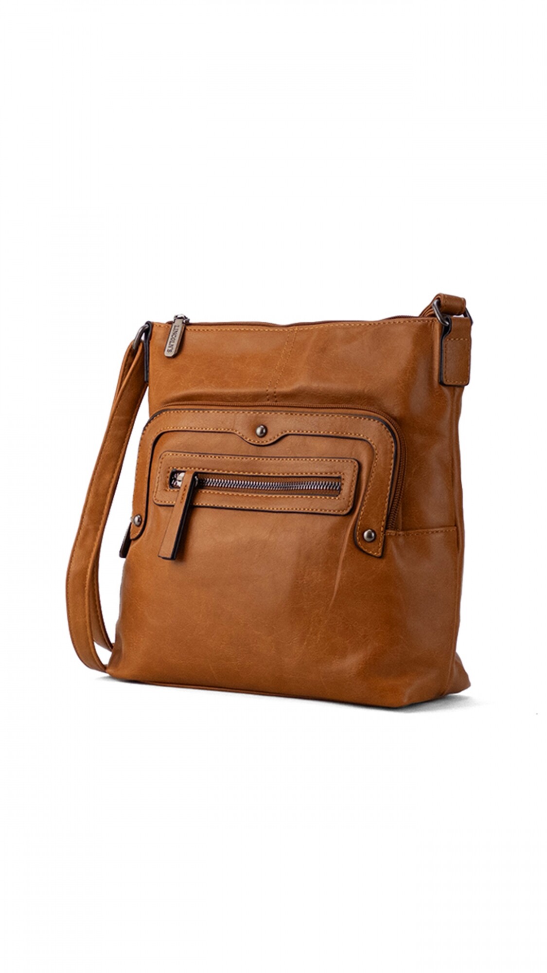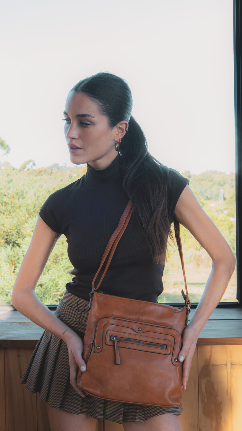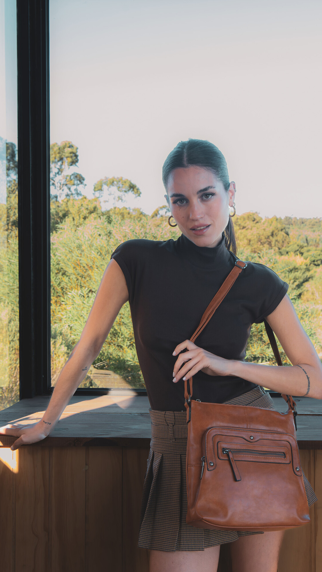 Bandolera en símil cuero con dos bolsillos al frente con cierre. Detalles tachas metálicas.