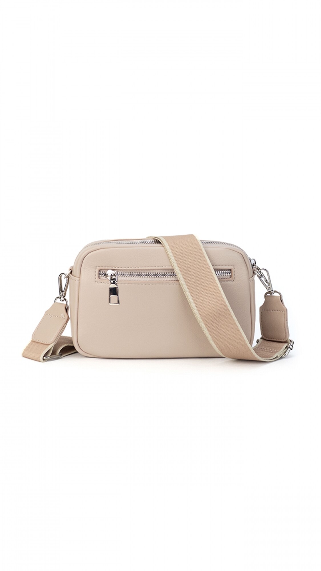 Incluye bolsillos internos y posterior. y correa de galón a tono larga y regulable.