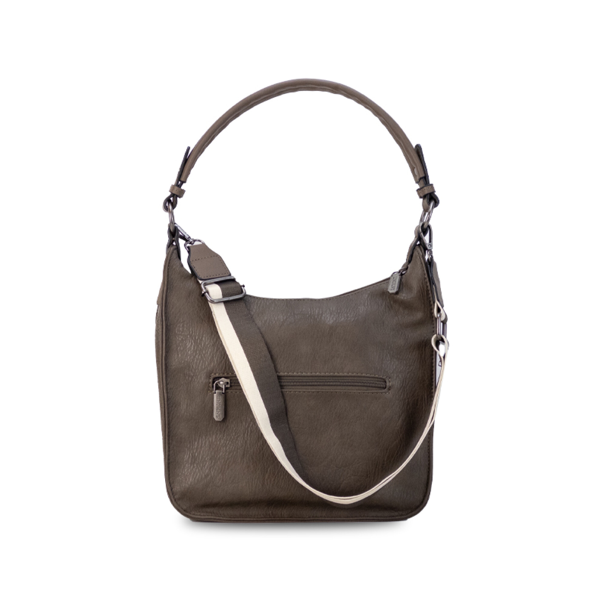 Bandolera con asa, cuenta con bolsillos con cierre en la parte frontal y dorsal para almacenamiento práctico.