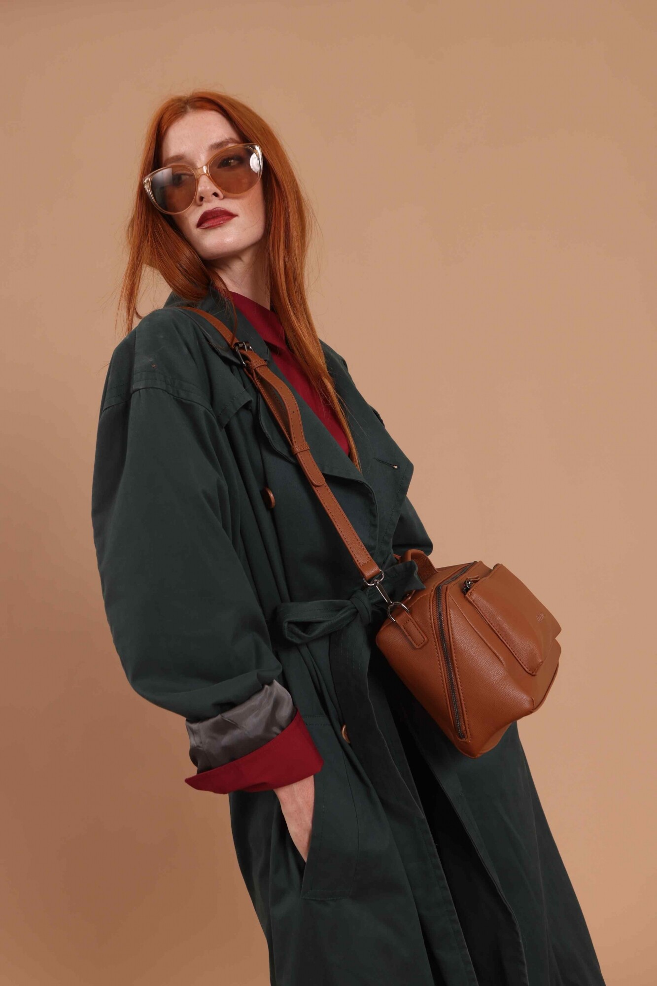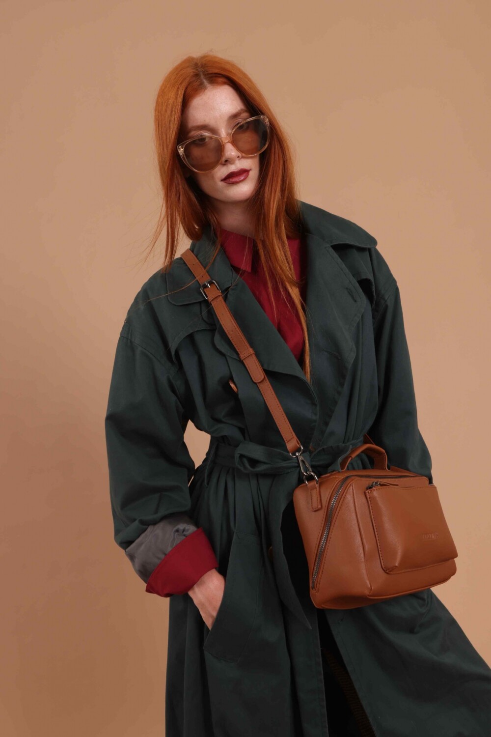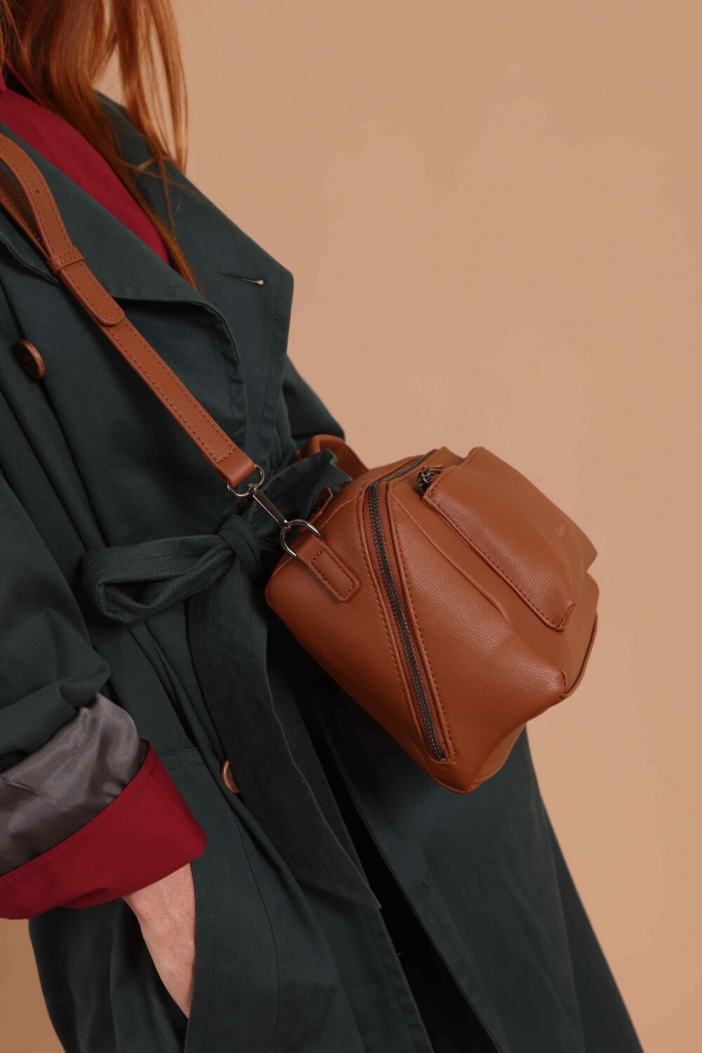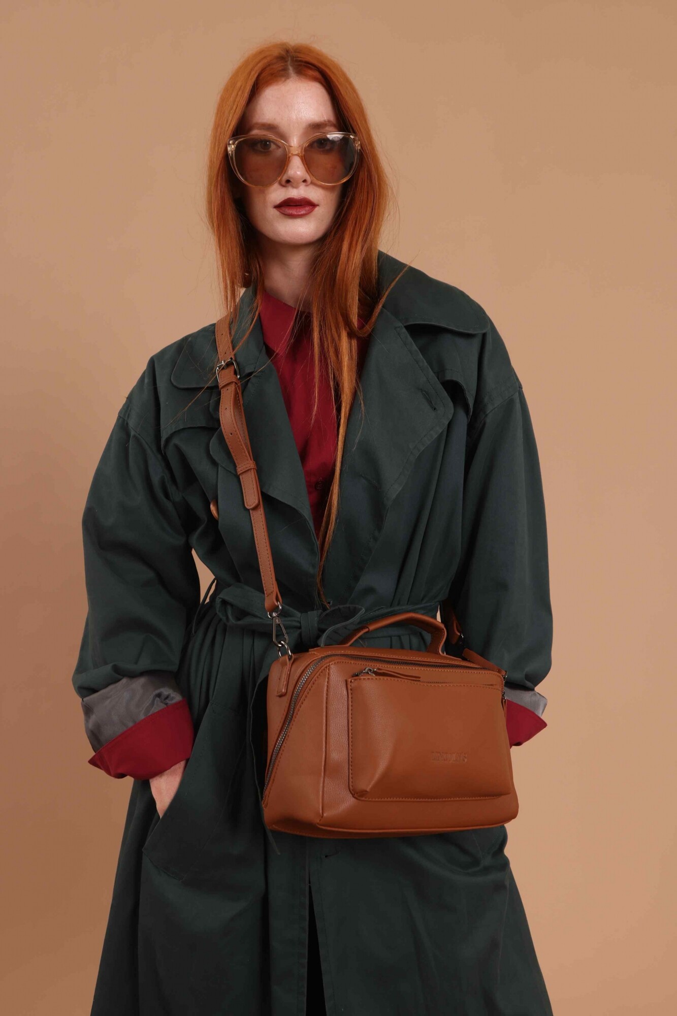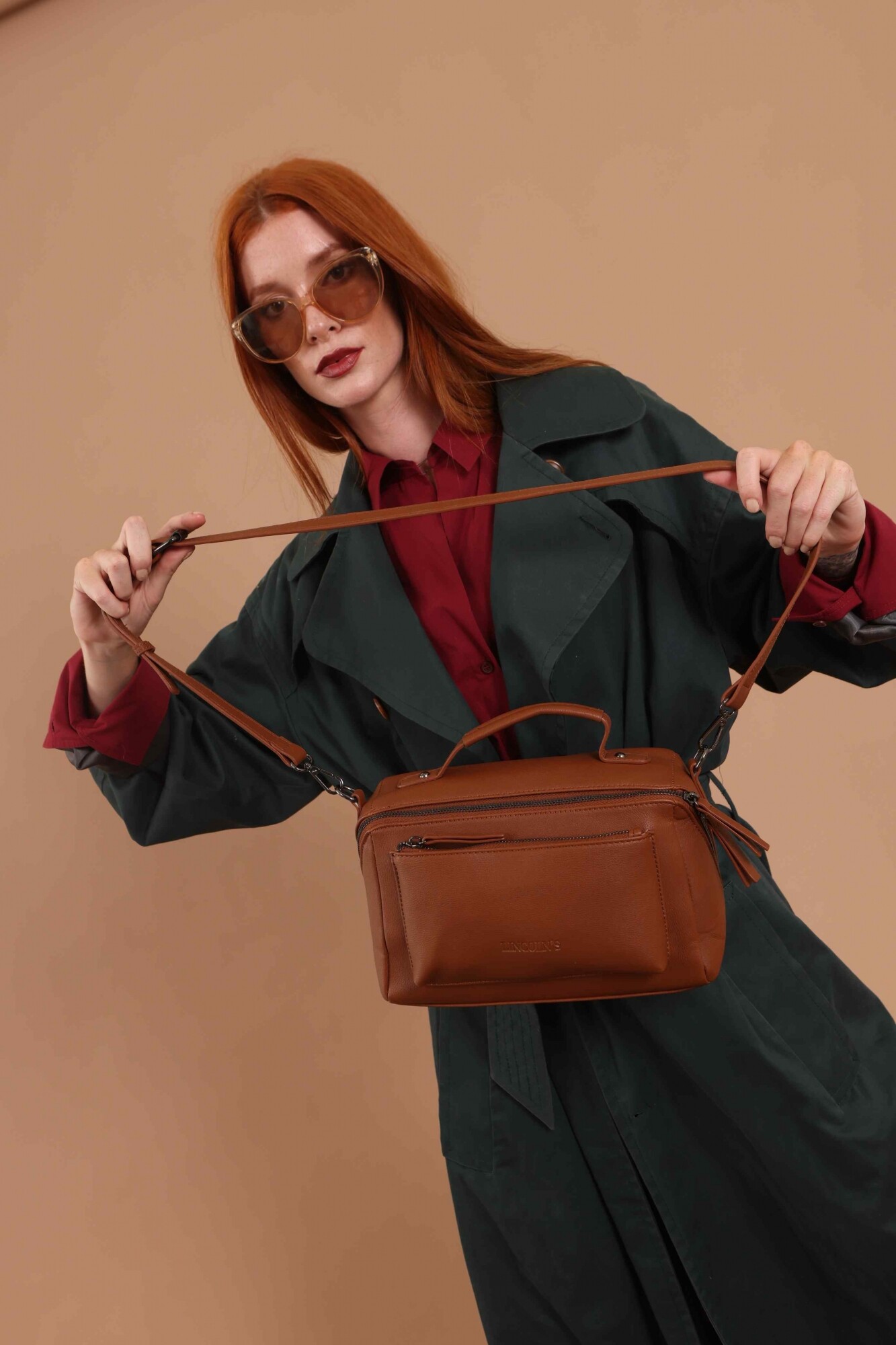 Bandolera con asa superior, y correa larga ajustable. Dos bolsillos frontales, uno de ellos con cierre cruzado generando un diseño práctico y elegante.