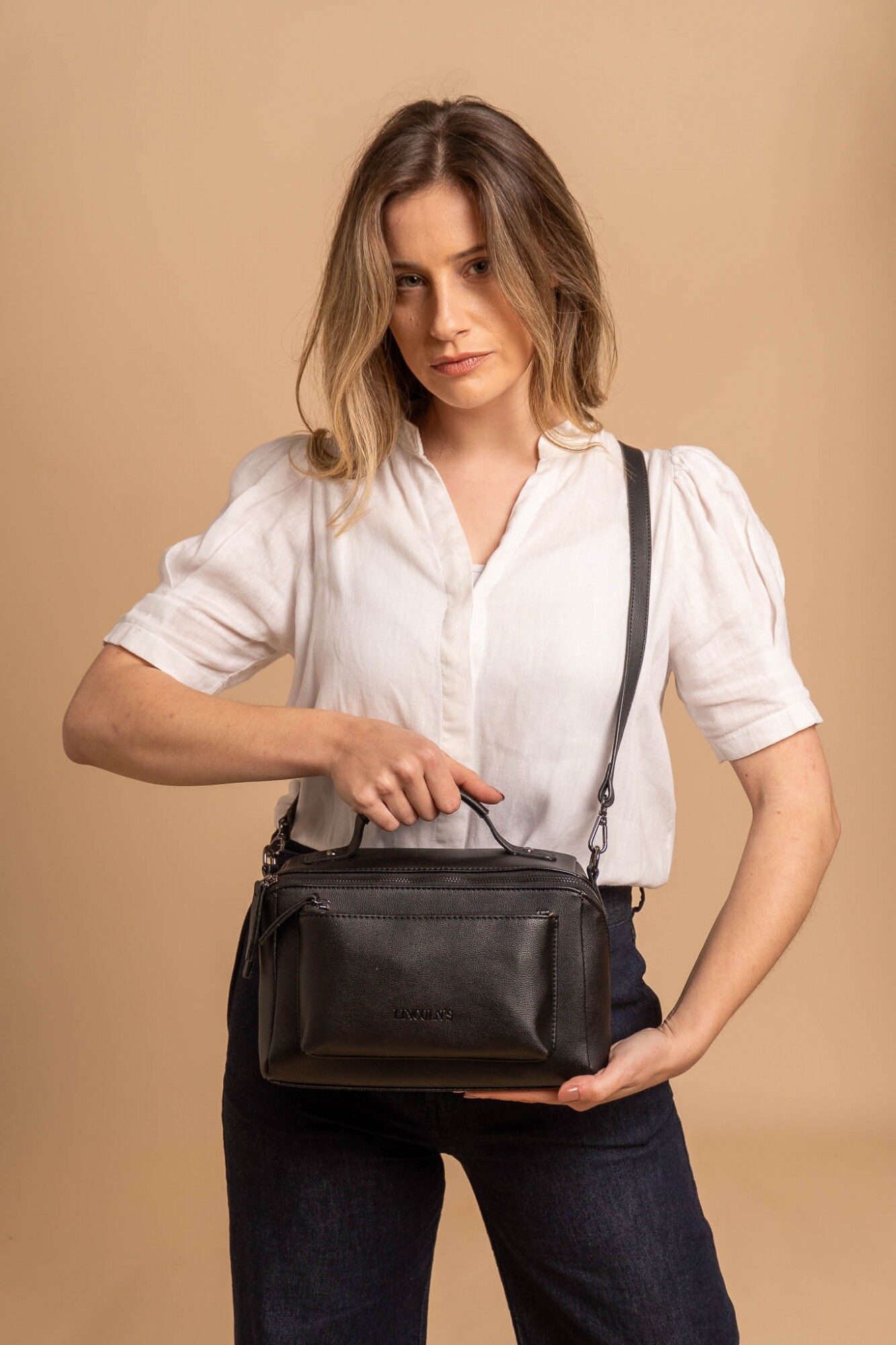 Bandolera con asa superior, y correa larga ajustable. Dos bolsillos frontales, uno de ellos con cierre cruzado generando un diseño práctico y elegante.