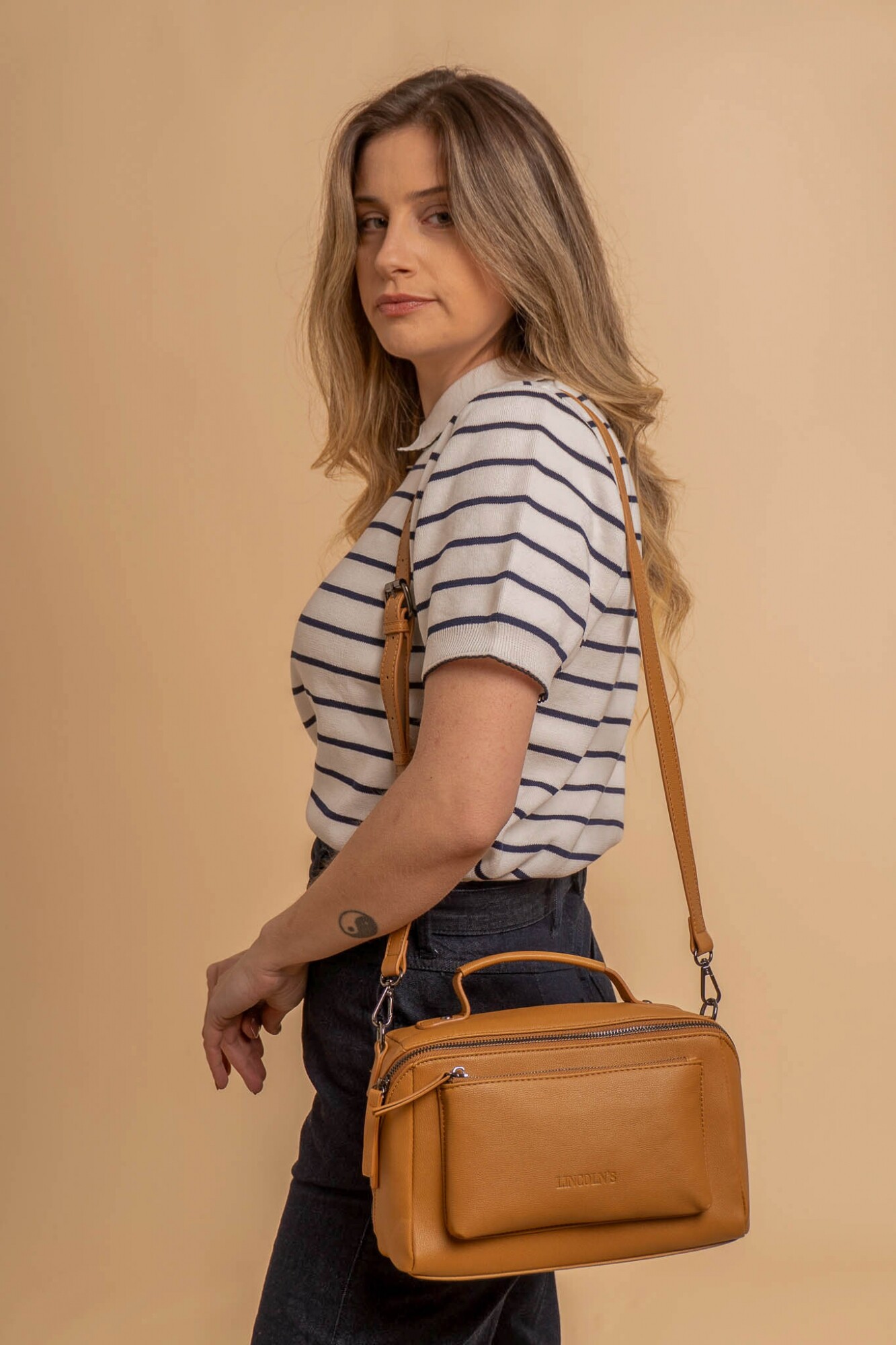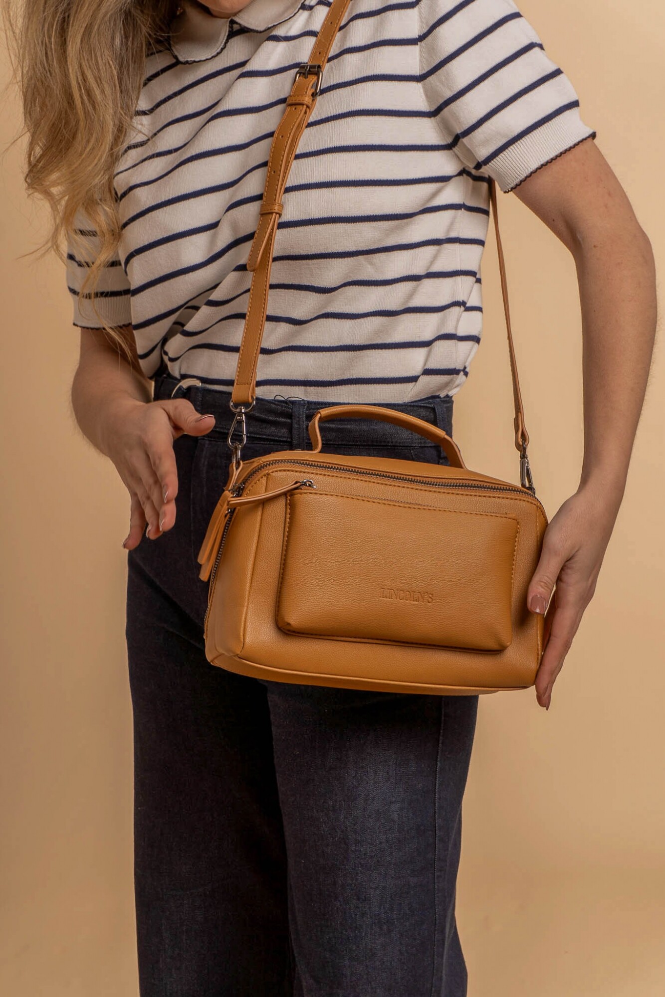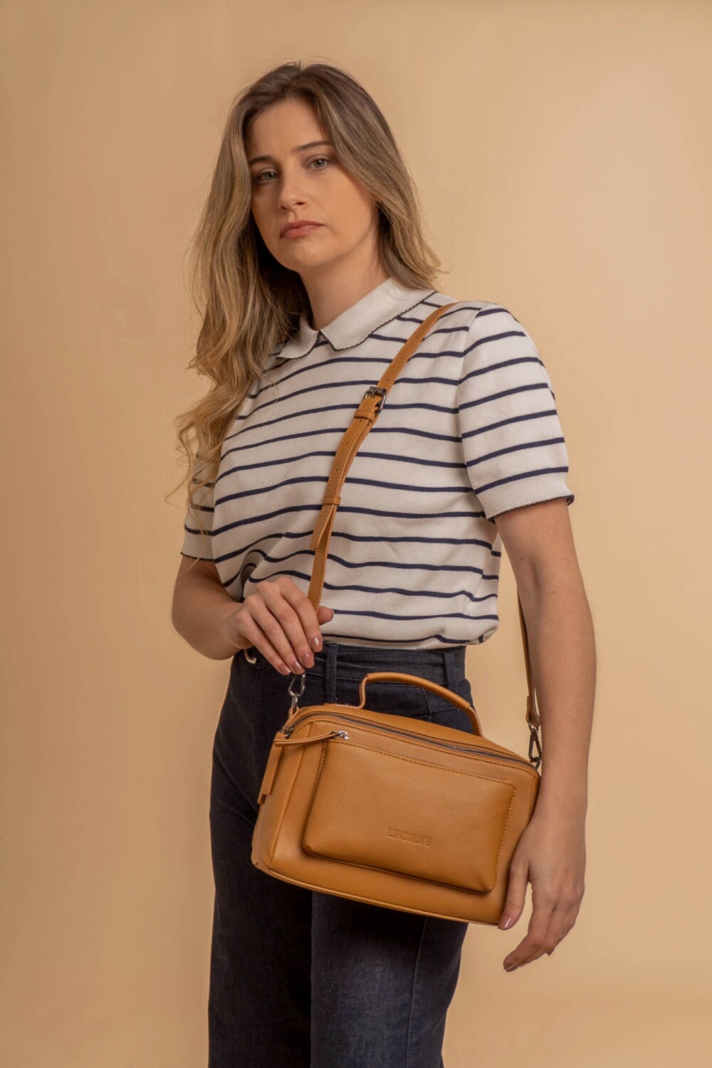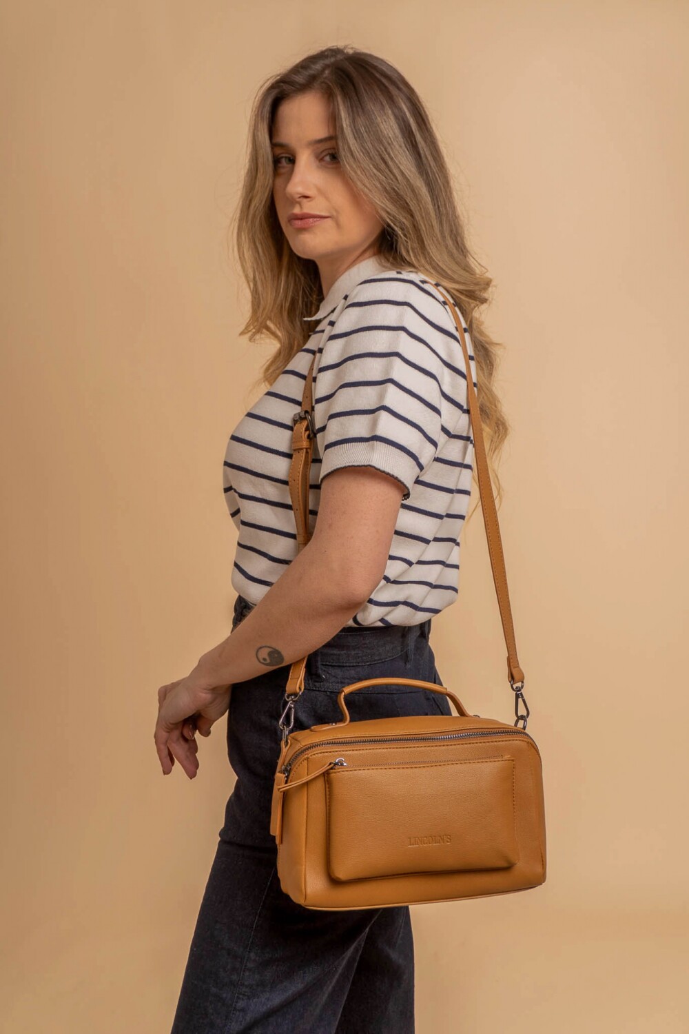 Bandolera con asa superior, y correa larga ajustable. Dos bolsillos frontales, uno de ellos con cierre cruzado generando un diseño práctico y elegante.
