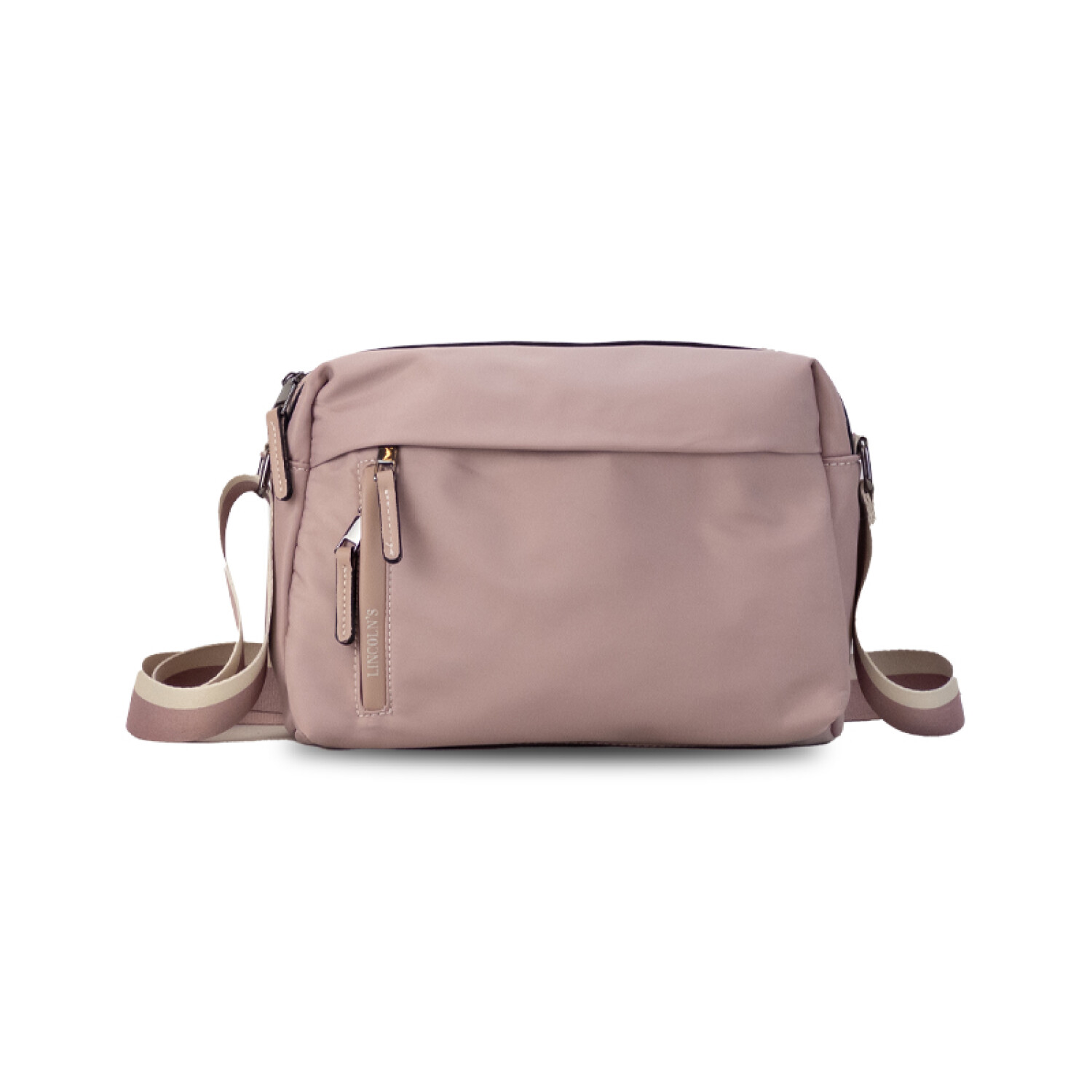 Bandolera con correa de galón a tono, dos bolsillos frontales con cierre y uno dorsal. Su bolsillo principal incluye reparticiones internas, ideal para mantener tus pertenencias organizadas y seguras.