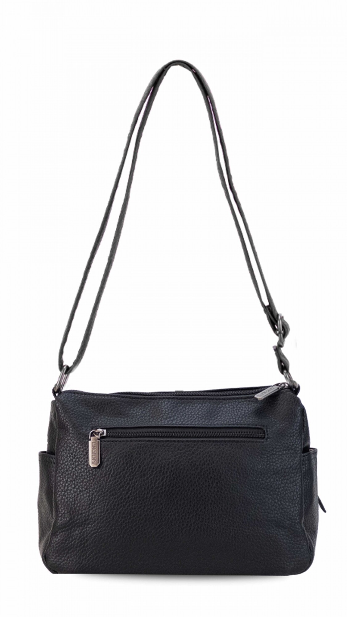 Bandolera práctica con dos bolsillos frontales: uno con tapa y cierre para mayor seguridad. Interior espacioso con bolsillos, ideal para llevar tus esenciales con estilo.