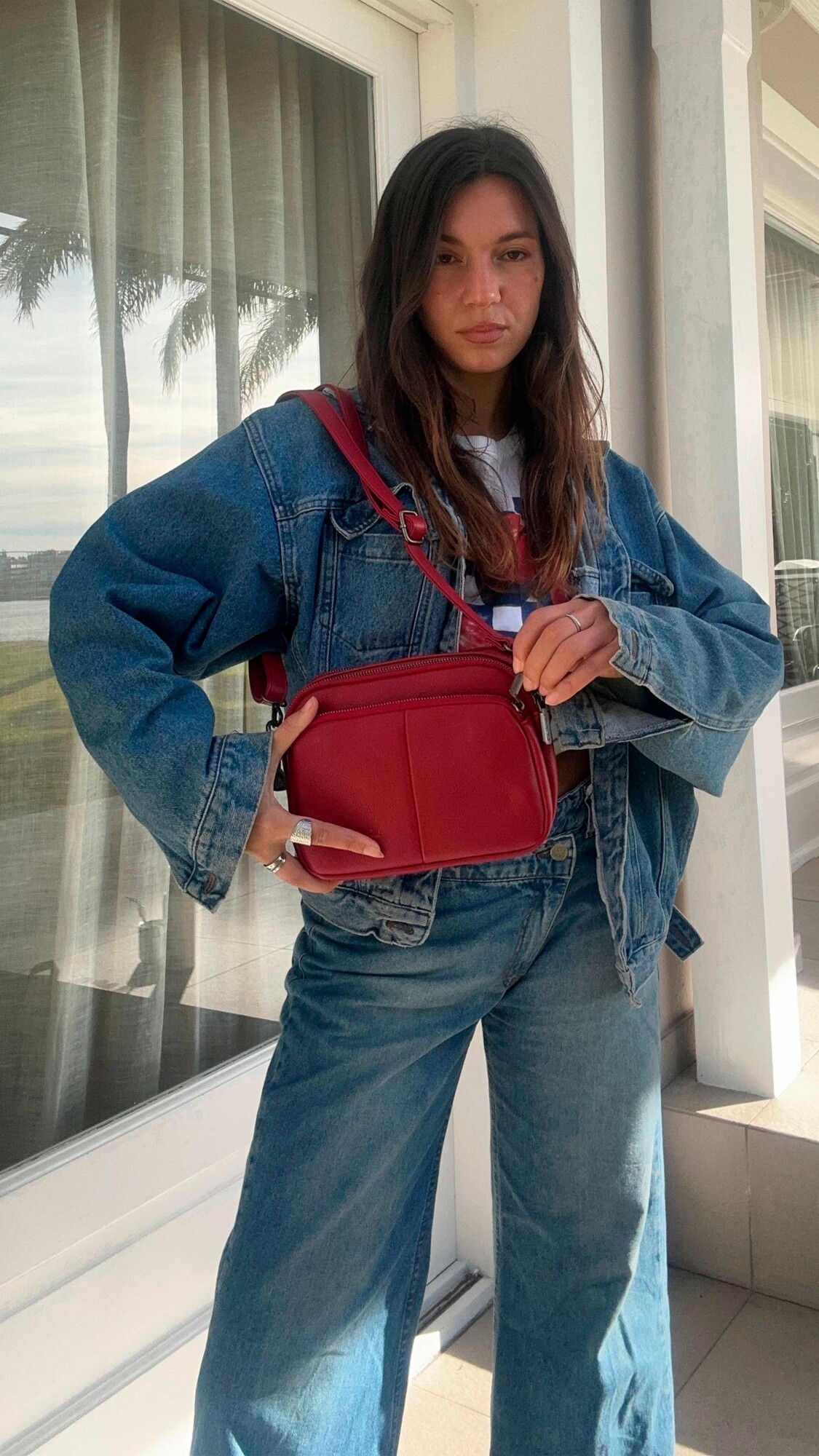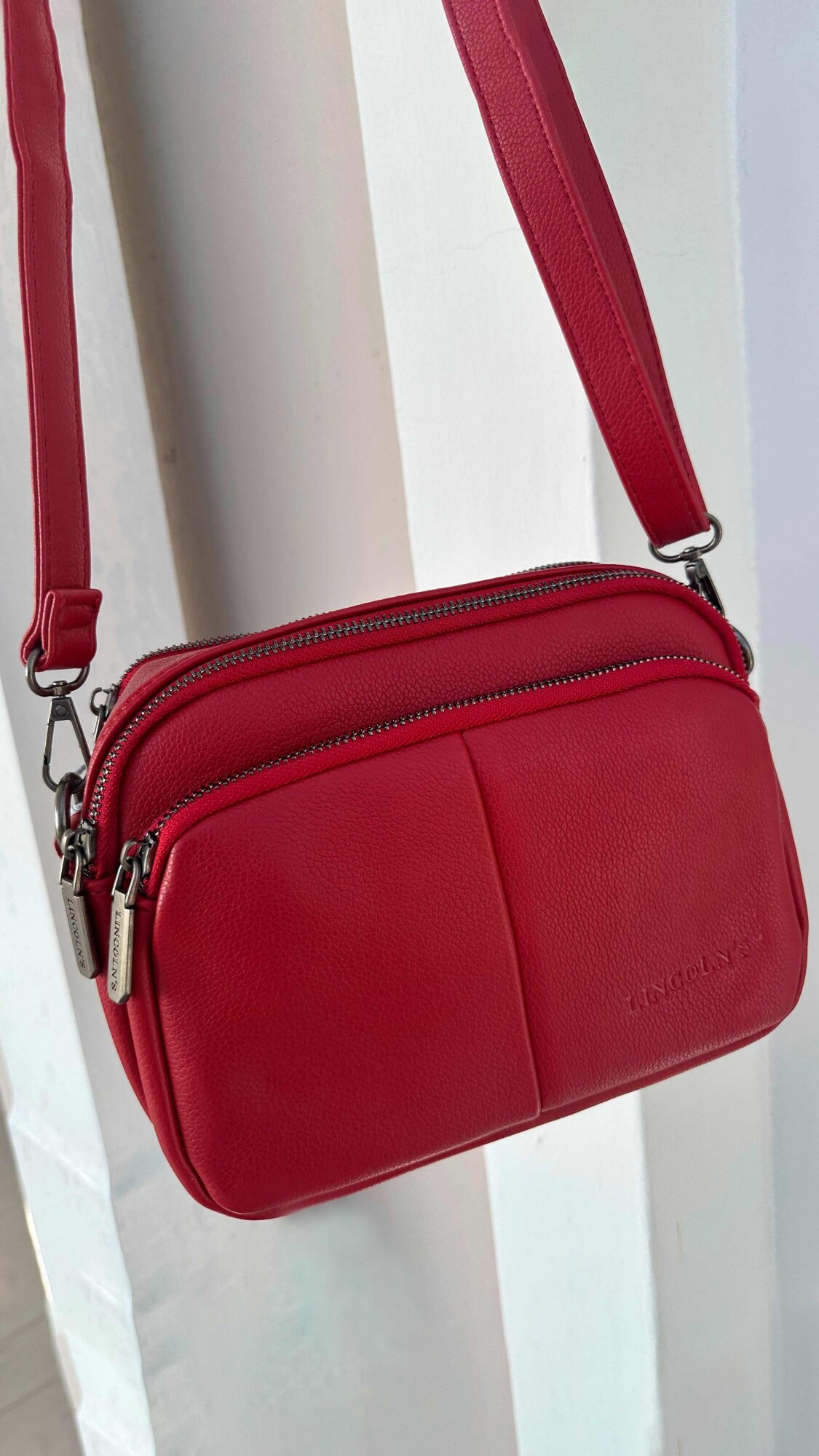 Bandolera con doble bolsillo principal, un bolsillo frontal y trasero. Incluye correa ajustable para mayor comodidad. Ideal para llevar lo esencial de manera práctica y segura.