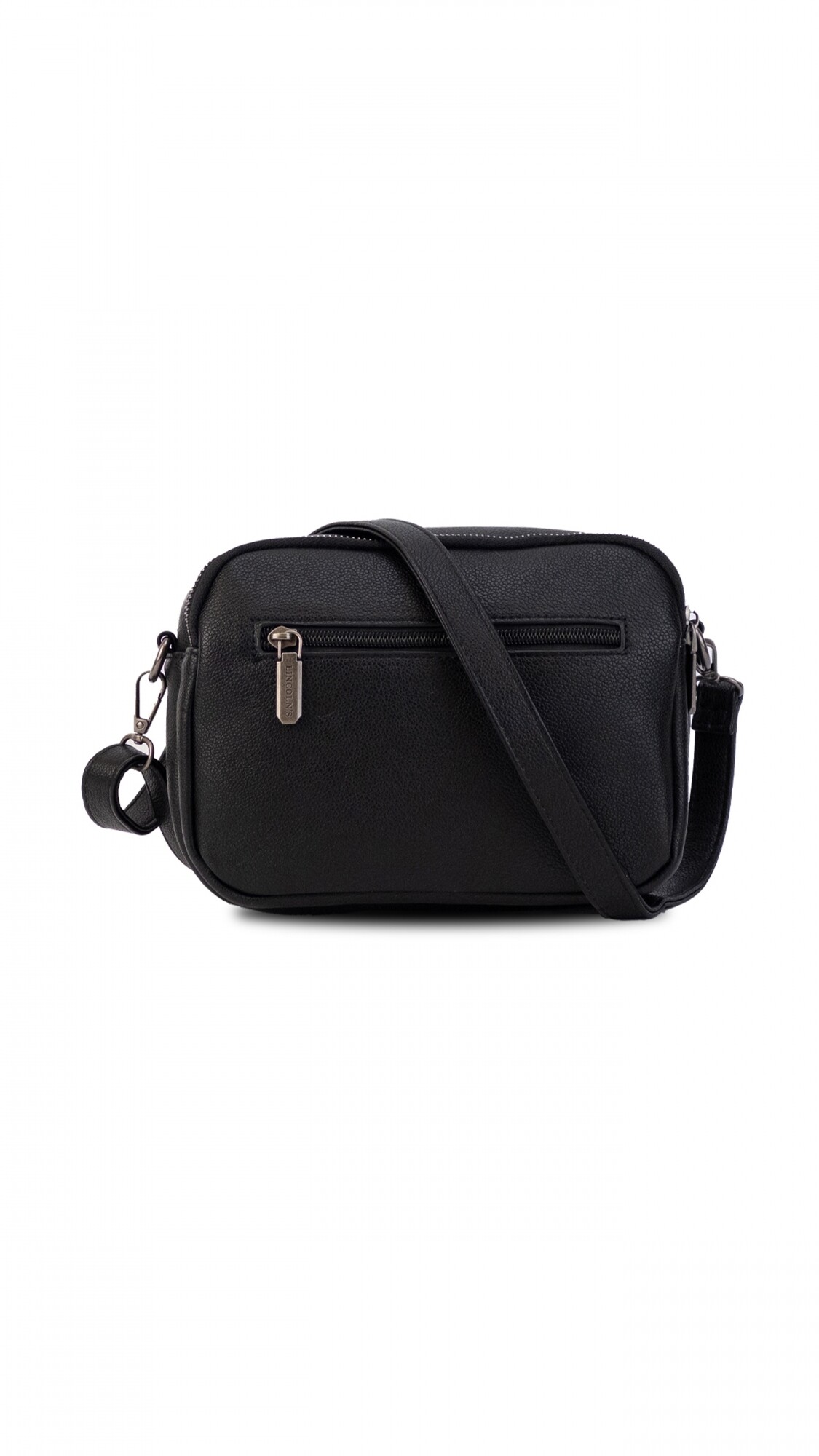 Bandolera con doble bolsillo principal, un bolsillo frontal y trasero. Incluye correa ajustable para mayor comodidad. Ideal para llevar lo esencial de manera práctica y segura.