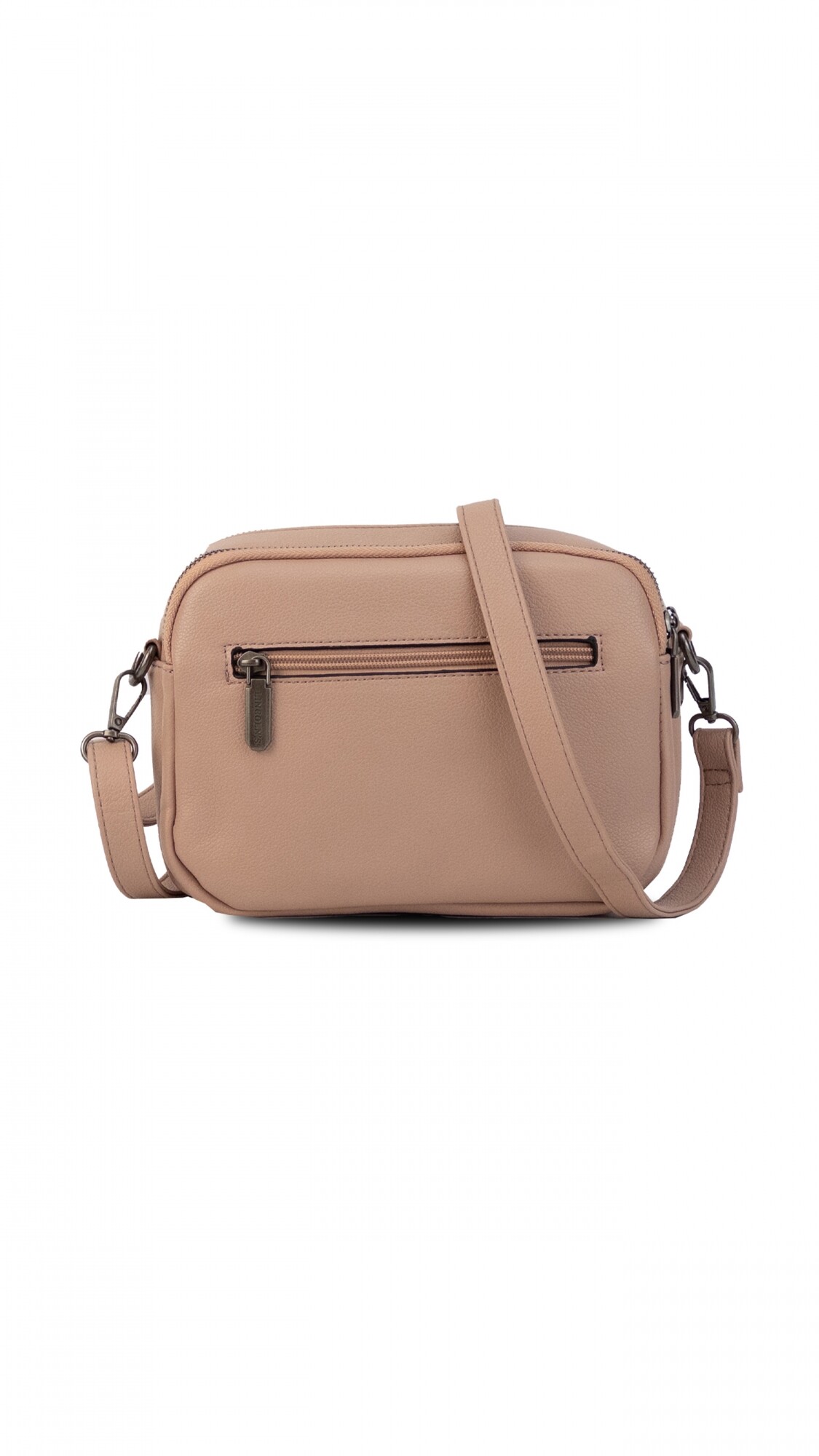 Bandolera con doble bolsillo principal, un bolsillo frontal y trasero. Incluye correa ajustable para mayor comodidad. Ideal para llevar lo esencial de manera práctica y segura.
