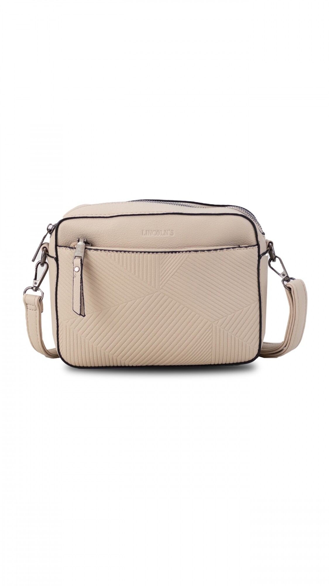 Bandolera elegante con practico bolsillo al frente de diseño texturado, con cierre de seguridad dorso y frente.