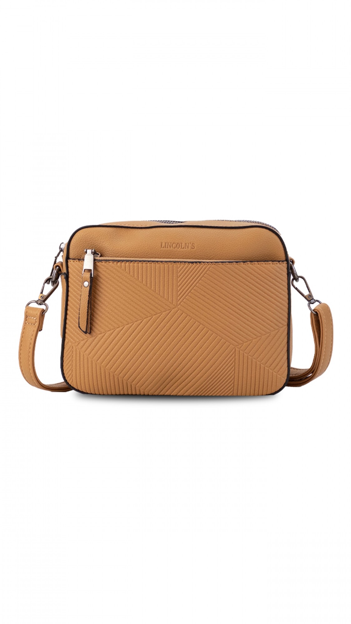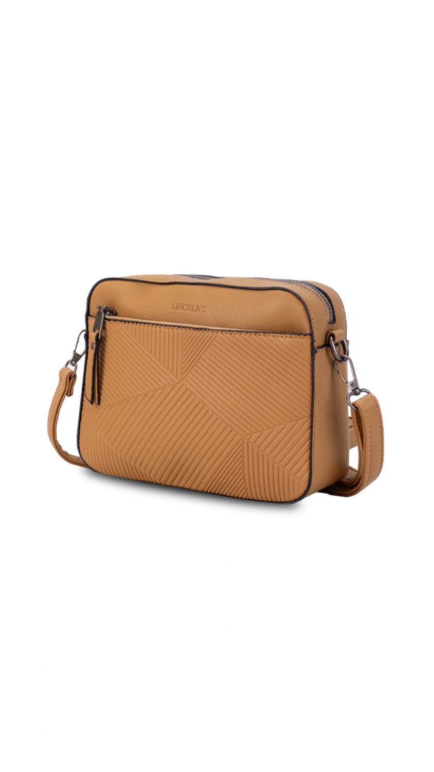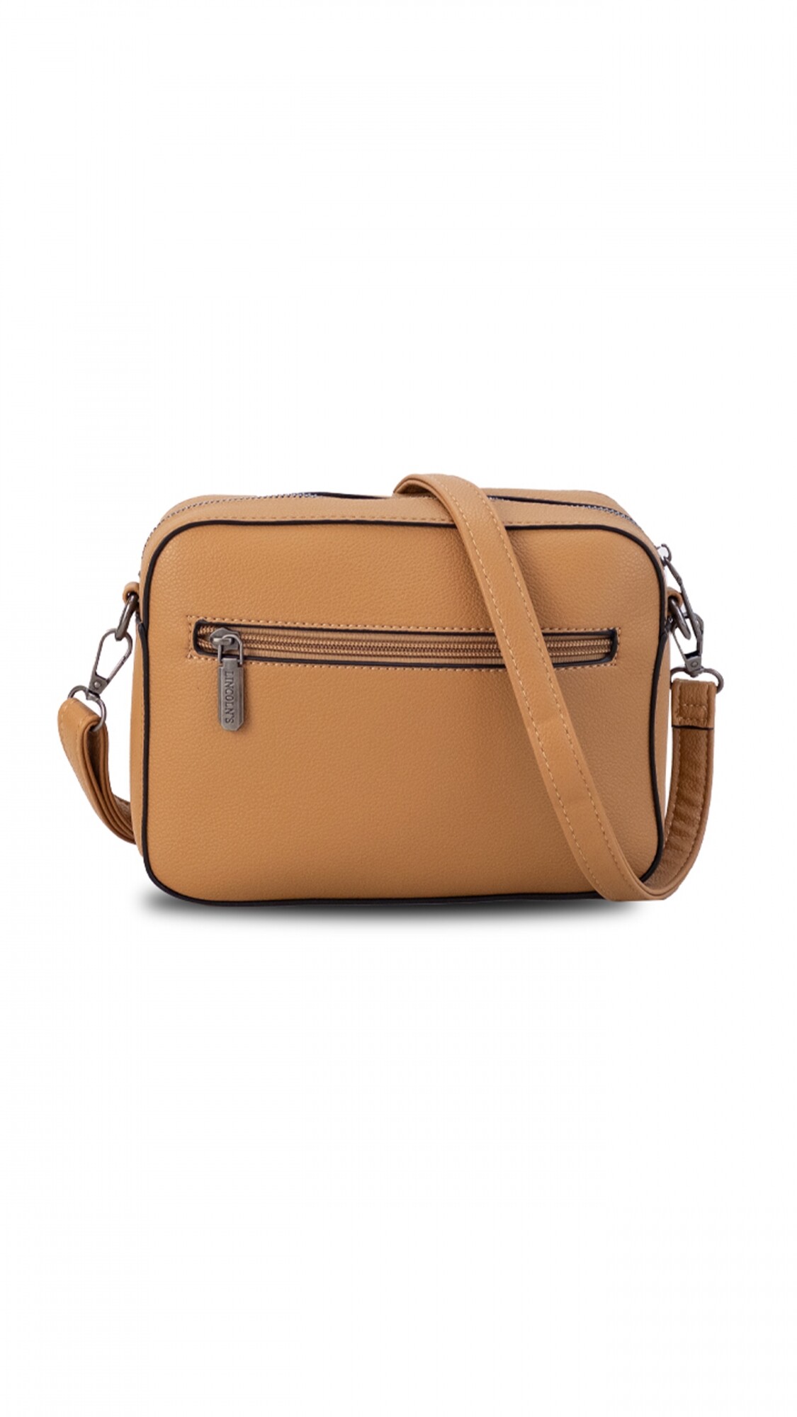 Bandolera elegante con practico bolsillo al frente de diseño texturado, con cierre de seguridad dorso y frente.