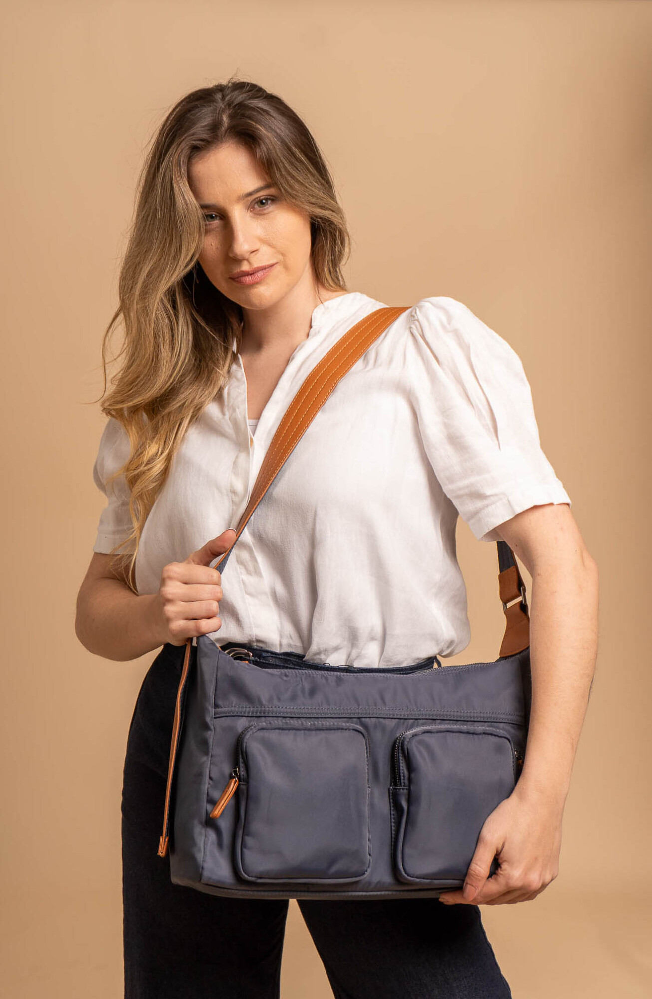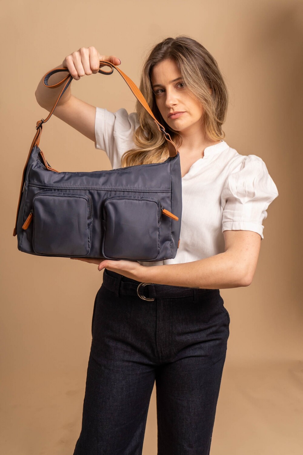 Cuenta con dos compartimientos principales, dos bolsillos con cierre y correa regulable con detalle de hebilla. Ideal para uso diario