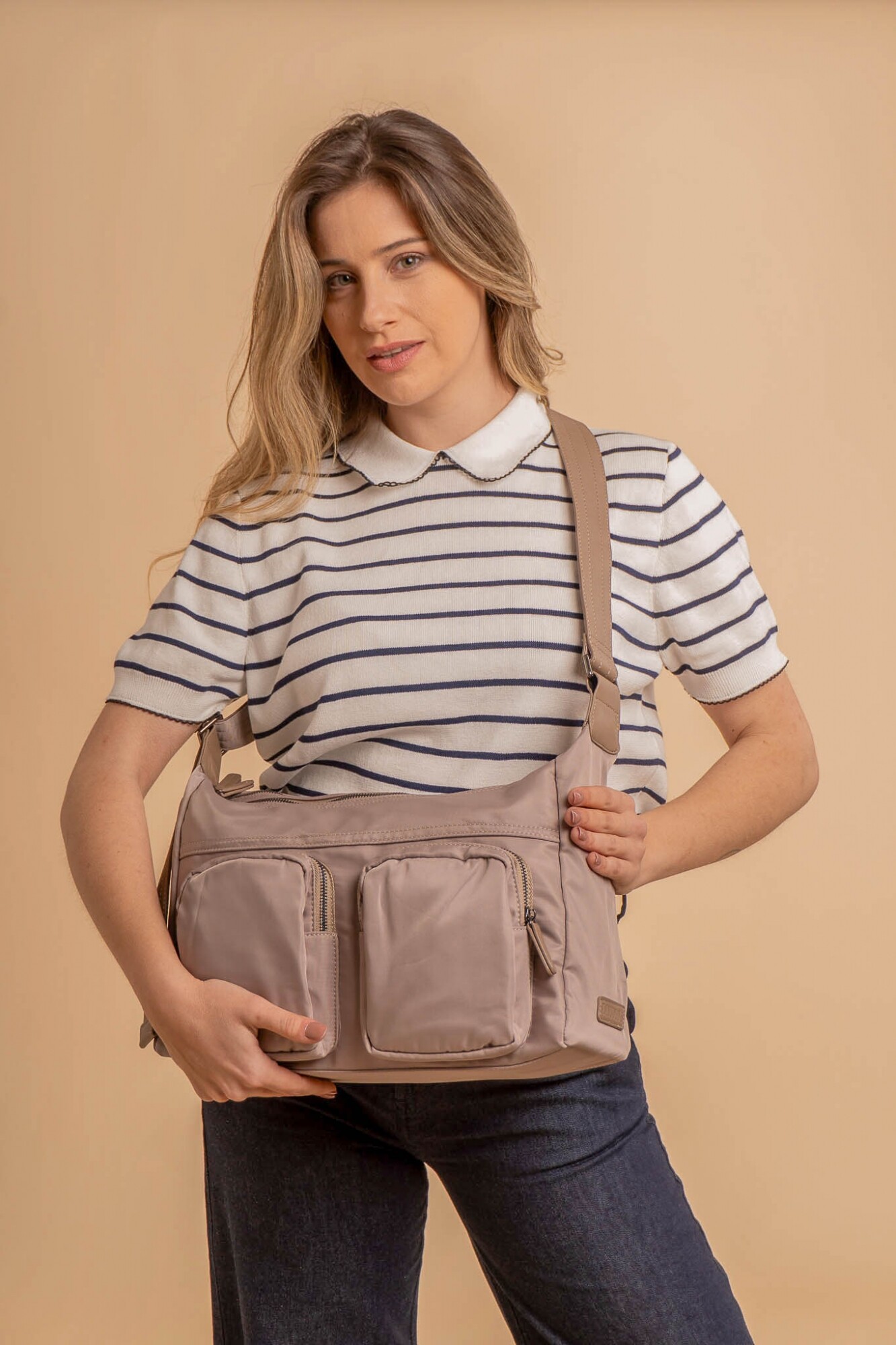 Cuenta con dos compartimientos principales, dos bolsillos con cierre y correa regulable con detalle de hebilla. Ideal para uso diario