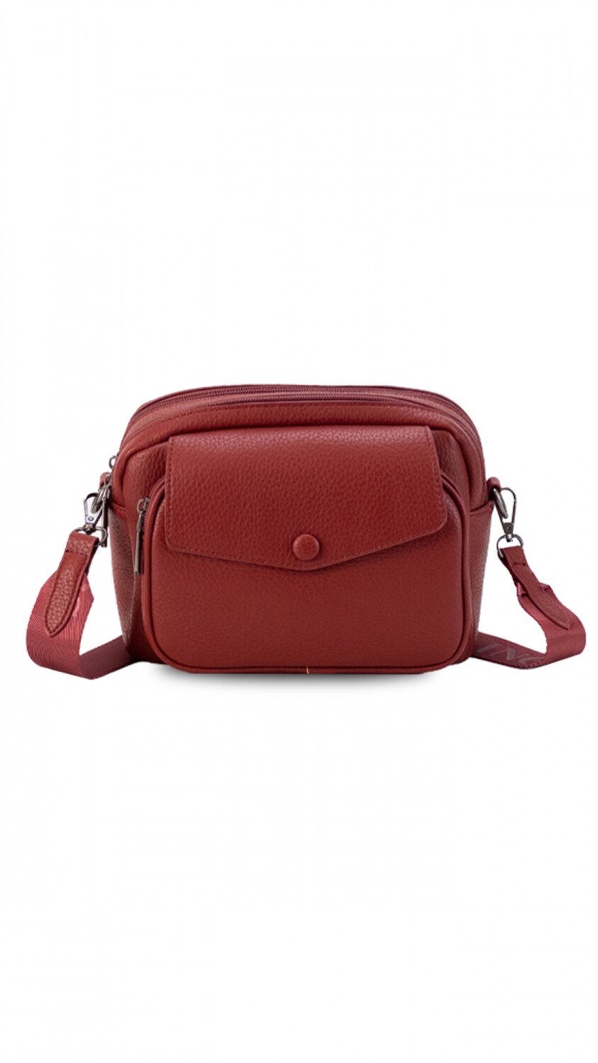 Bandolera elegante con dos cierres principales, bolsillos interiores para una mejor organización y correa galón. Incluye un bolsillo posterior con cierre y un bolsillo frontal con detalle de botón en la tapa.