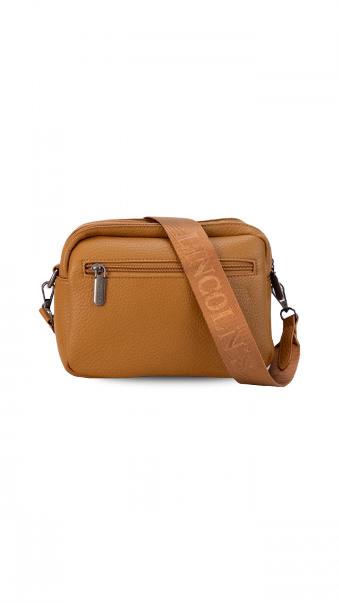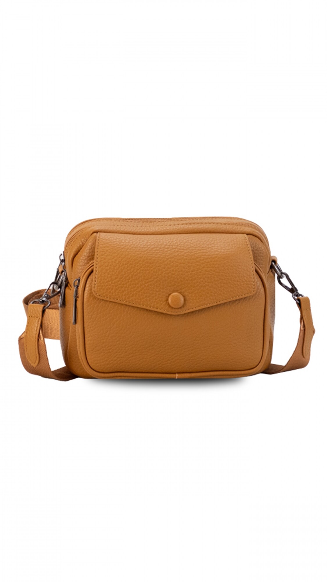 Bandolera elegante con dos cierres principales, bolsillos interiores para una mejor organización y correa galón. Incluye un bolsillo posterior con cierre y un bolsillo frontal con detalle de botón en la tapa.