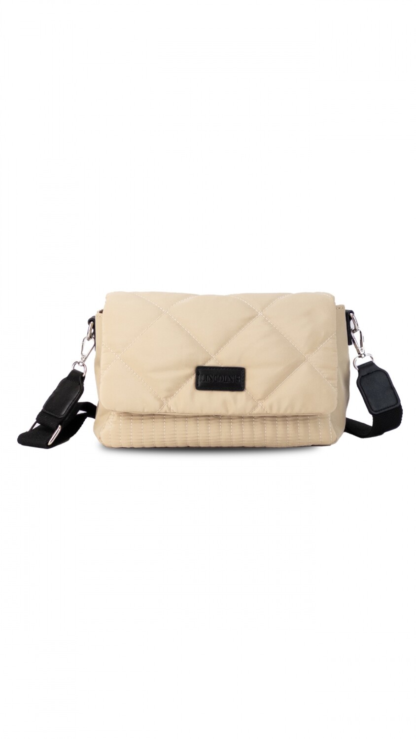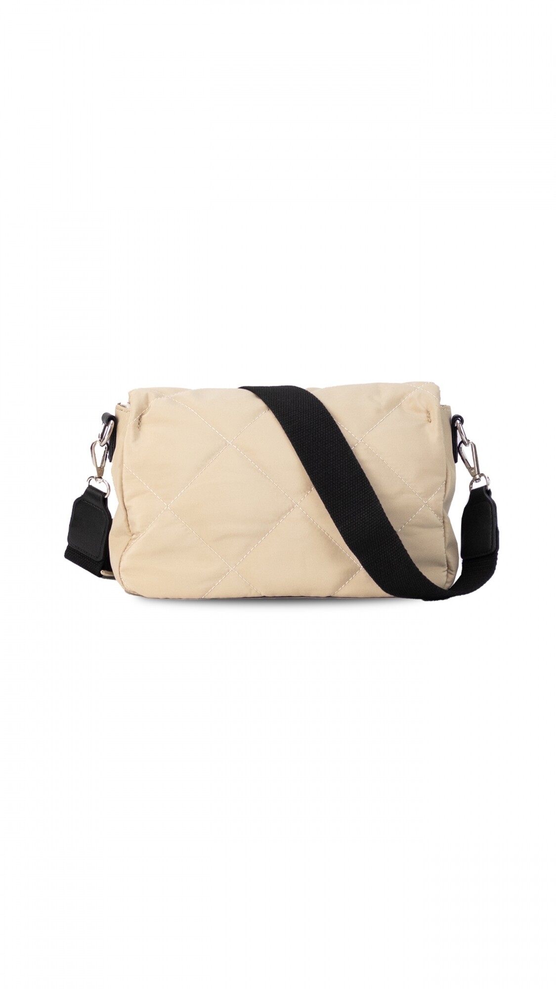 Bandolera capitoneada con bolsillo interno, correa de galón ajustable y tapa con broche. Diseño práctico y moderno, ideal para un look casual. Perfecta para llevar lo esencial con estilo y comodidad.