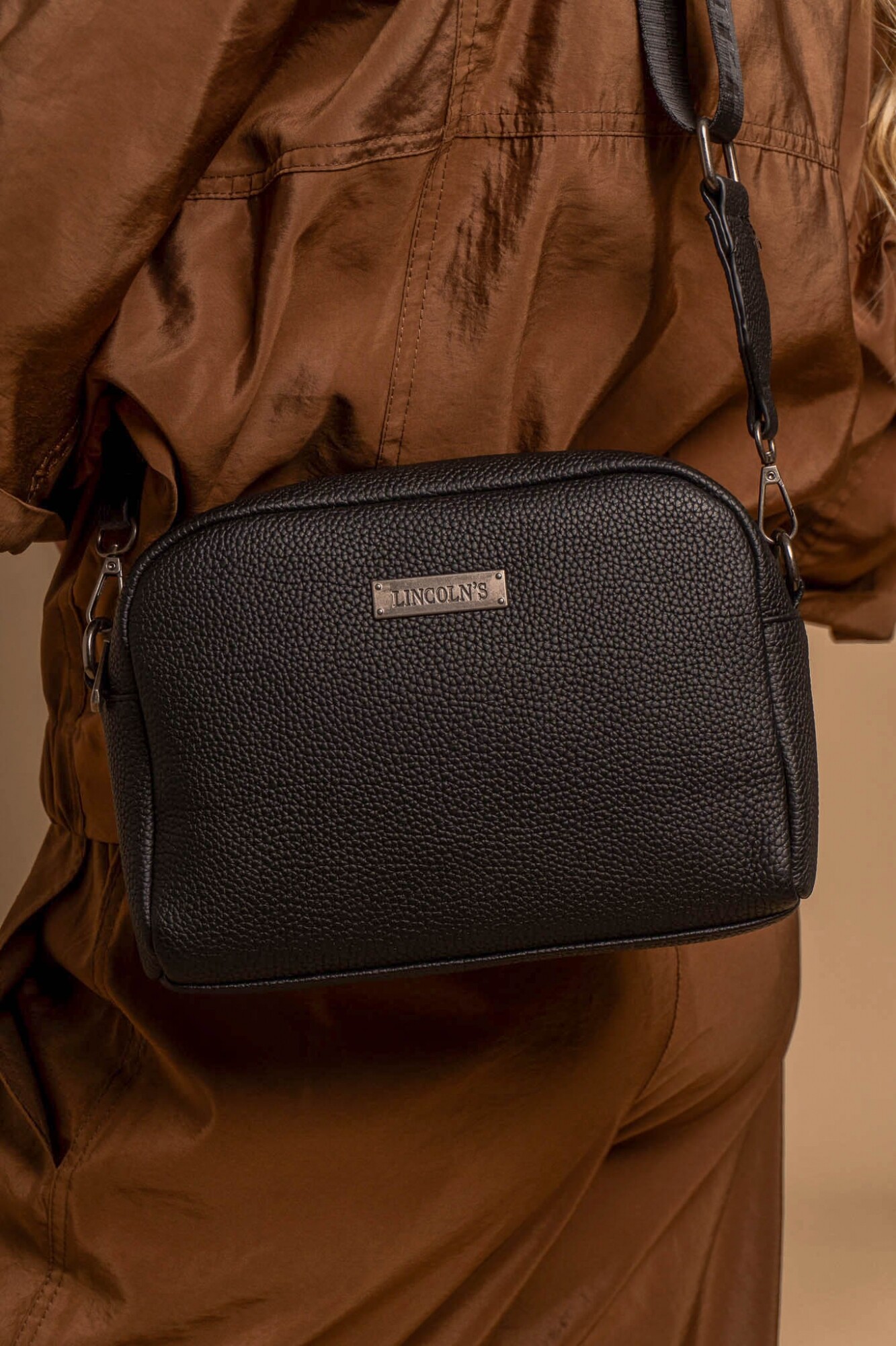 Bandolera compacta con textura tipo piel, correa ajustable negra con logo “LINCOLN’S” en relieve. Diseño moderno y versátil, ideal para uso diario o casual.