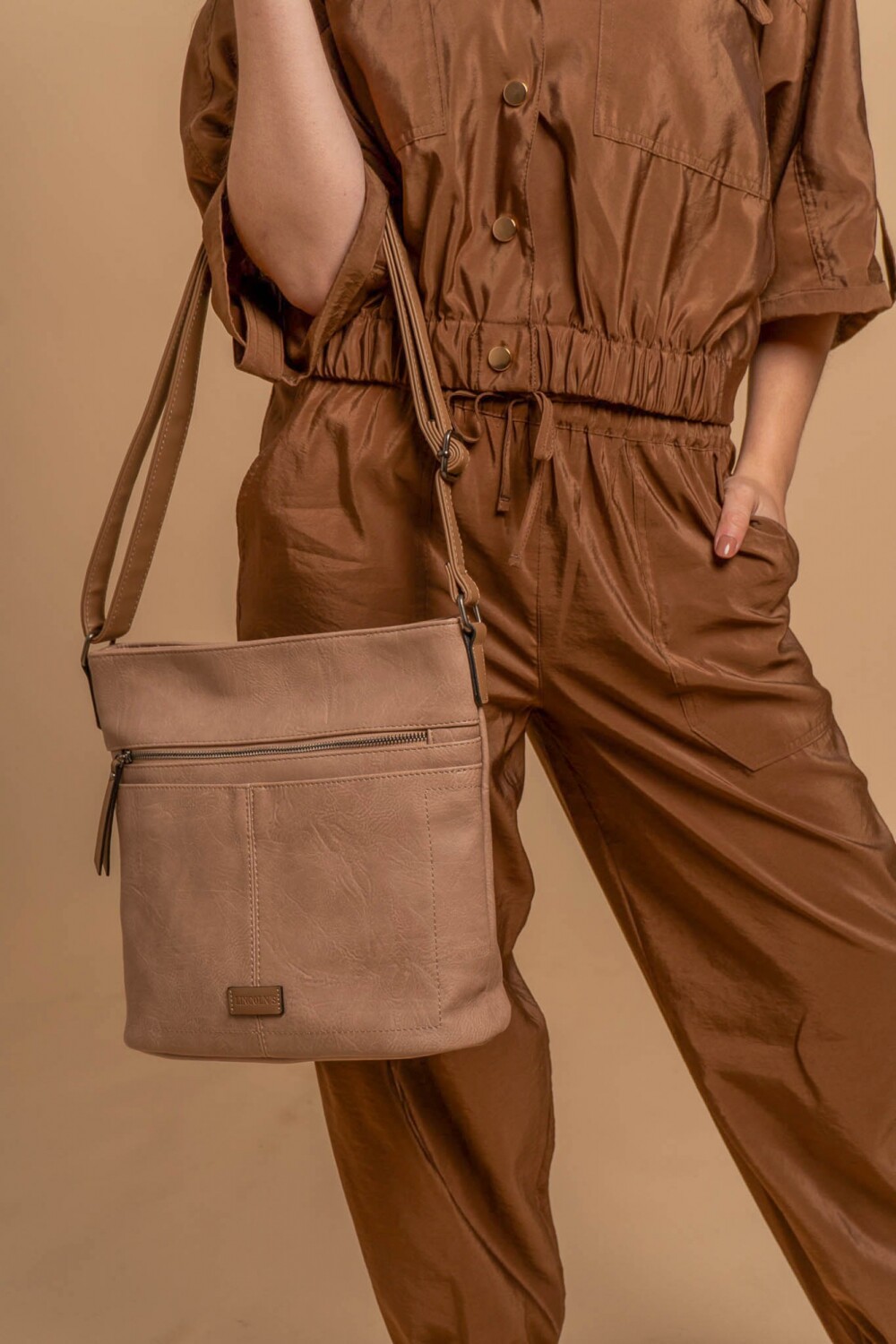 Cartera bandolera mediana con correa regulable en símil cuero. Cuenta con dos compartimientos y un bolsillo frontal con cierre. Diseño moderno y funcional, ideal para uso diario.