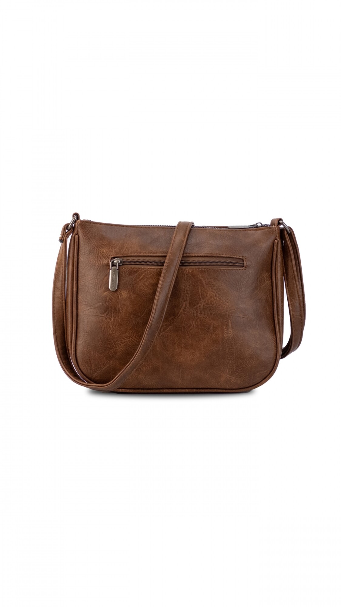 Bandolera con tapa y broche, bolsillo principal y bolsillos internos organizadores y cierre trasero para mayor seguridad. Diseño práctico y elegante, ideal para llevar todo lo necesario de forma cómoda y ordenada.