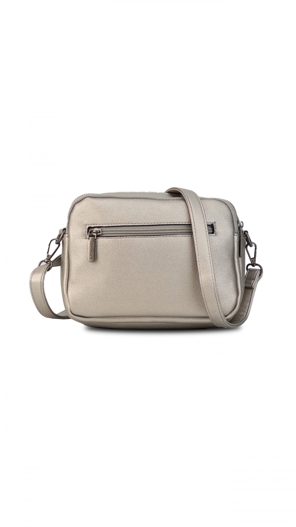 Bandolera con doble bolsillo principal, un bolsillo frontal y trasero. Incluye correa ajustable para mayor comodidad. Ideal para llevar lo esencial de manera práctica y segura.