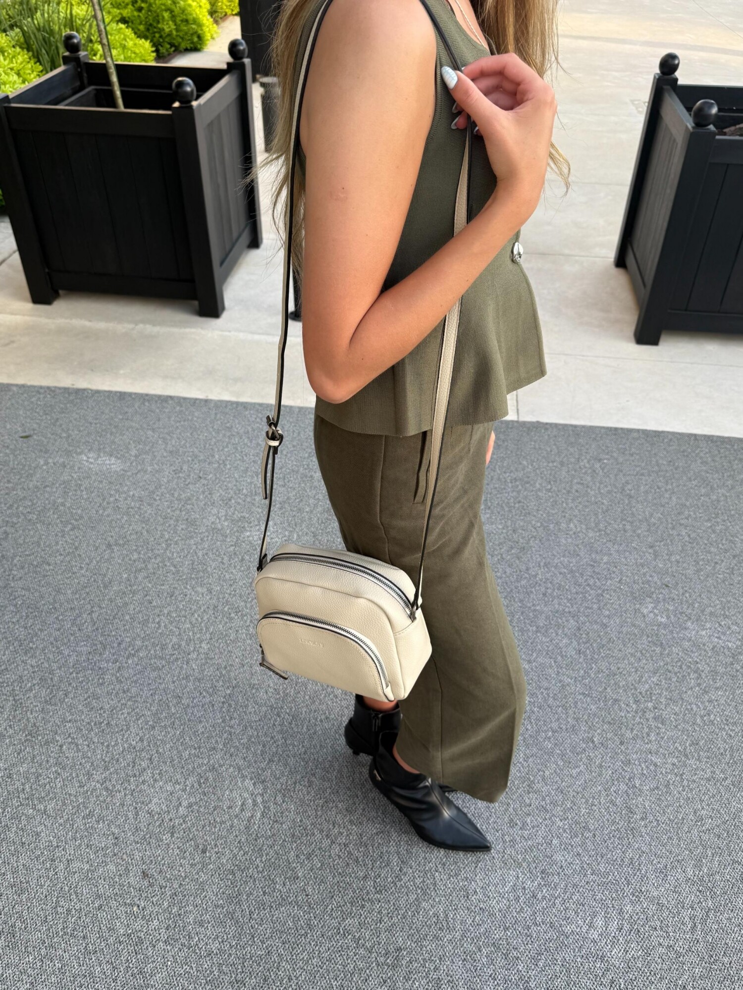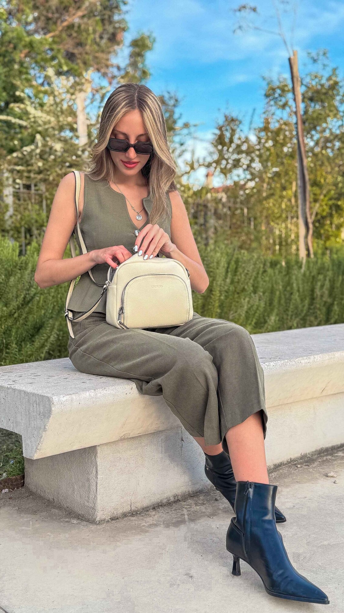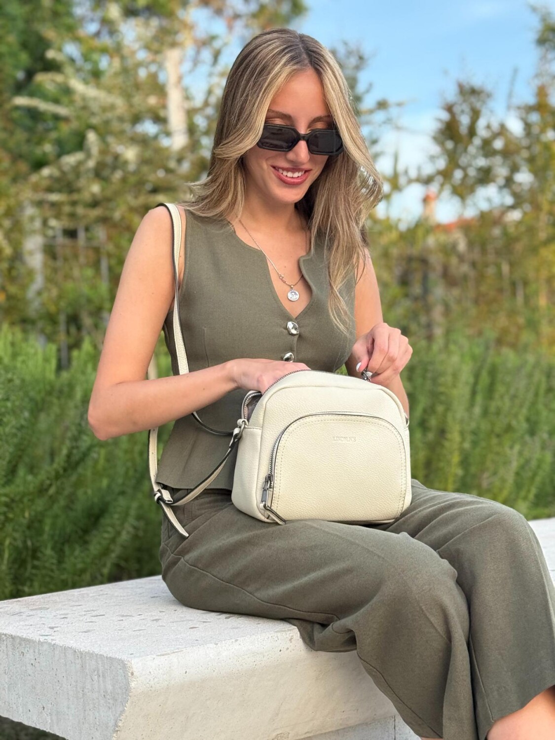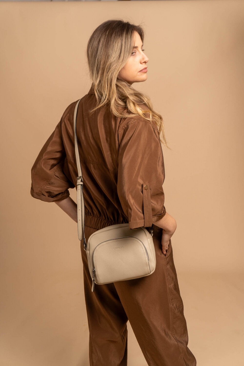 Bandolera de diseño compacto y elegante, con bolsillos frontal y cierre. Correa regulable, ideal para uso diario y combinar con cualquier look.