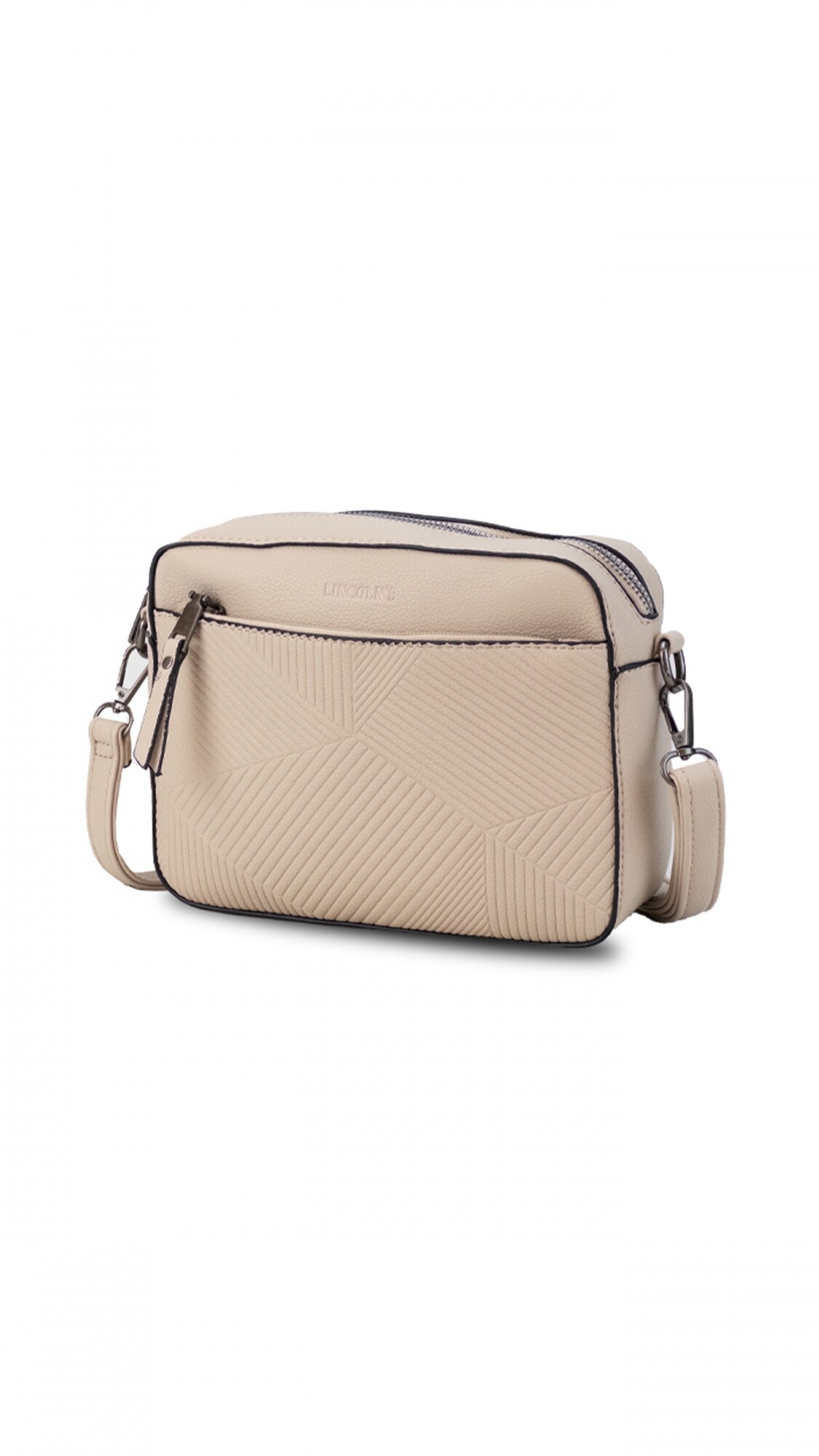 Bandolera elegante con practico bolsillo al frente de diseño texturado, con cierre de seguridad dorso y frente.