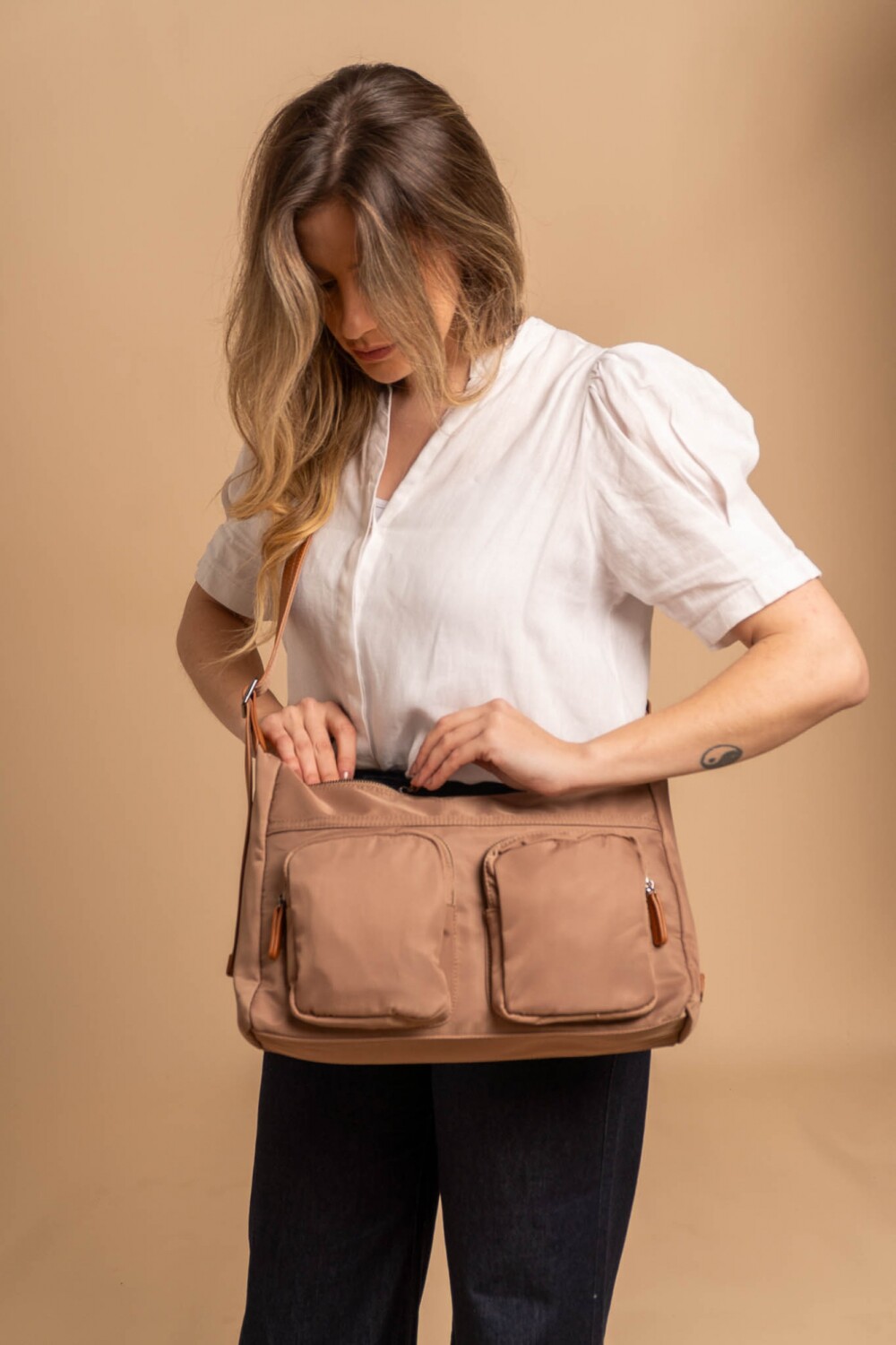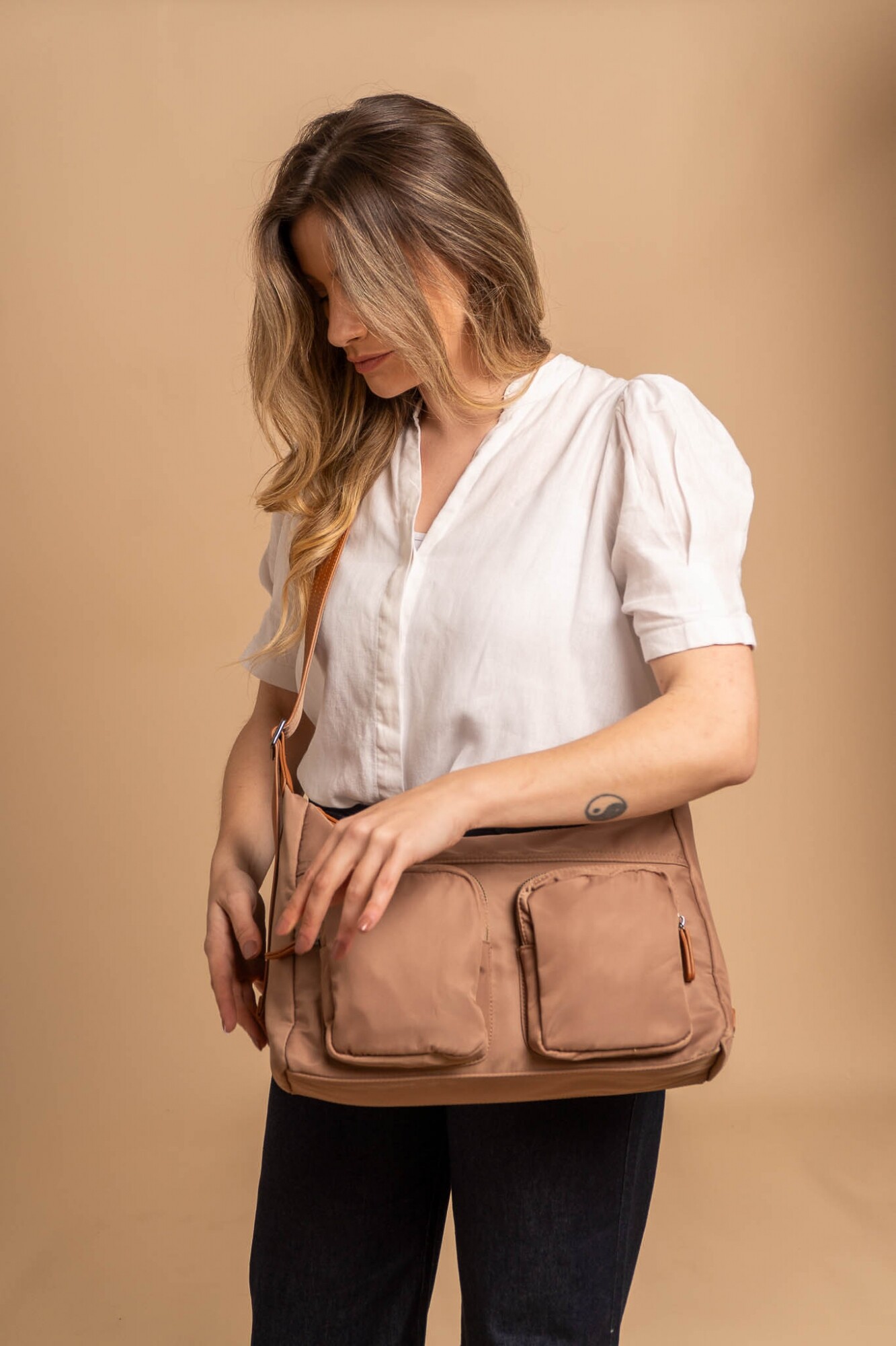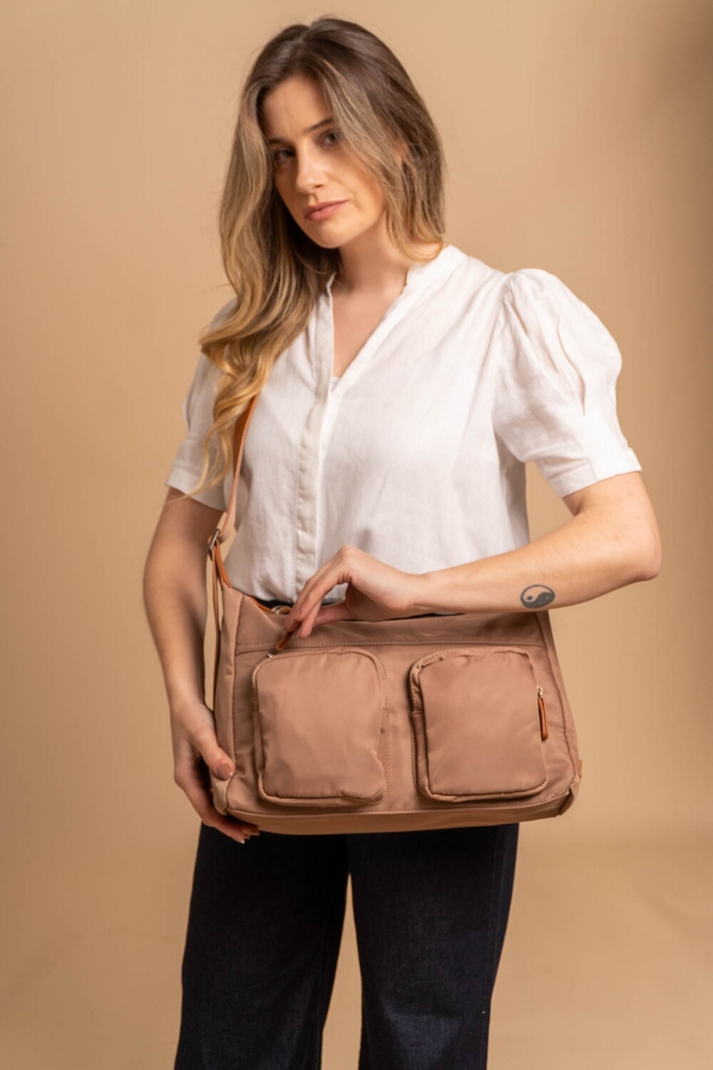 Cuenta con dos compartimientos principales, dos bolsillos con cierre y correa regulable con detalle de hebilla. Ideal para uso diario