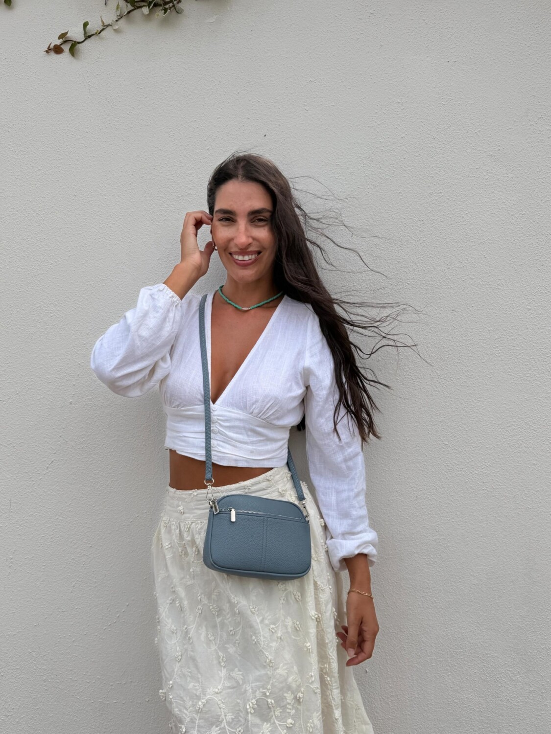 Bandolera pequeña y compacta en símil cuero, con correa fina ajustable del mismo material. Cuenta con bolsillo interno del mismo forro en seda y dos compartimientos con cierre.