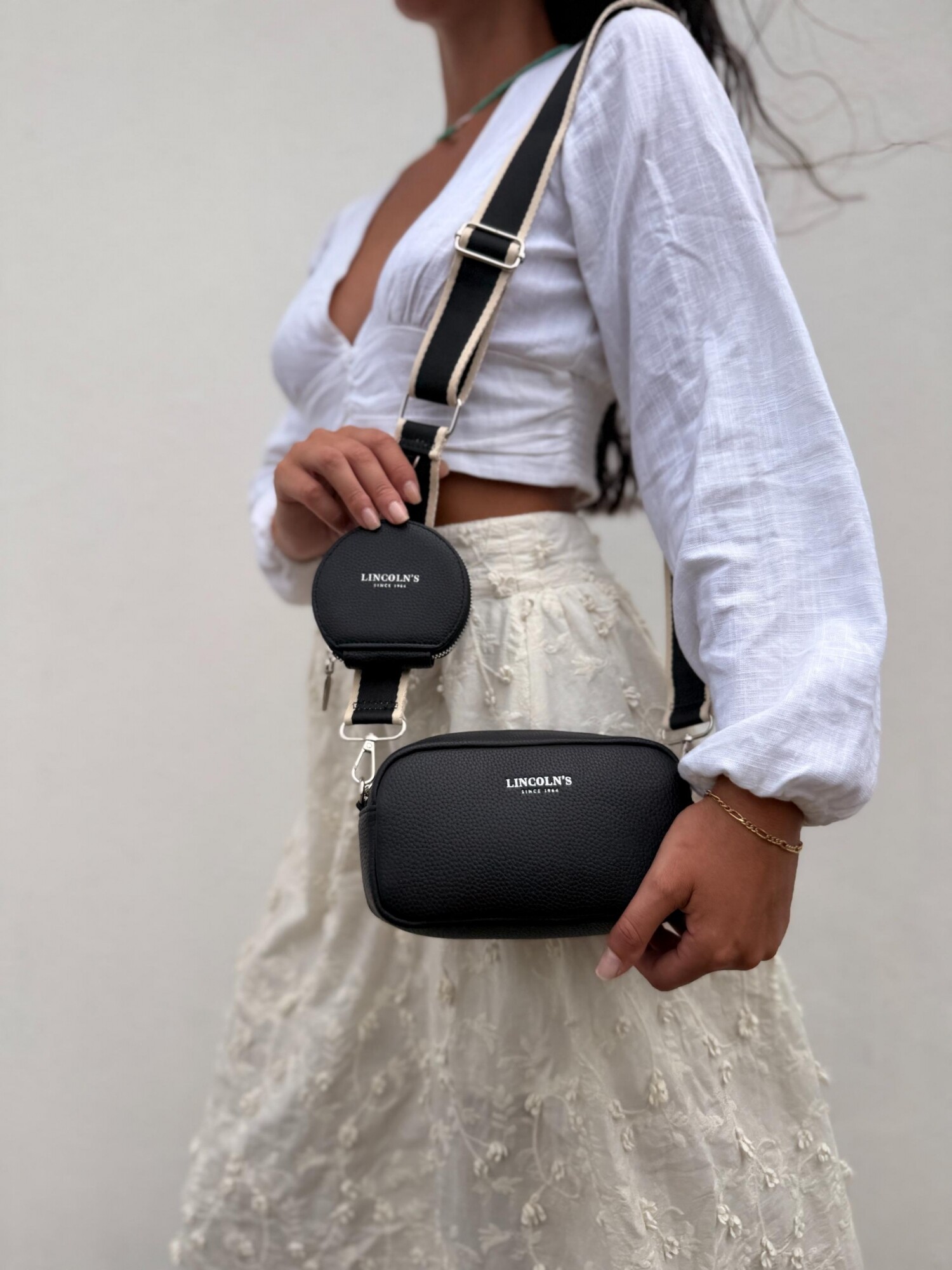 Bandolera compacta y moderna realizada en símil cuero, con correa regulable y monedero desmontable. Practica y perfecta para llevar lo esencial.