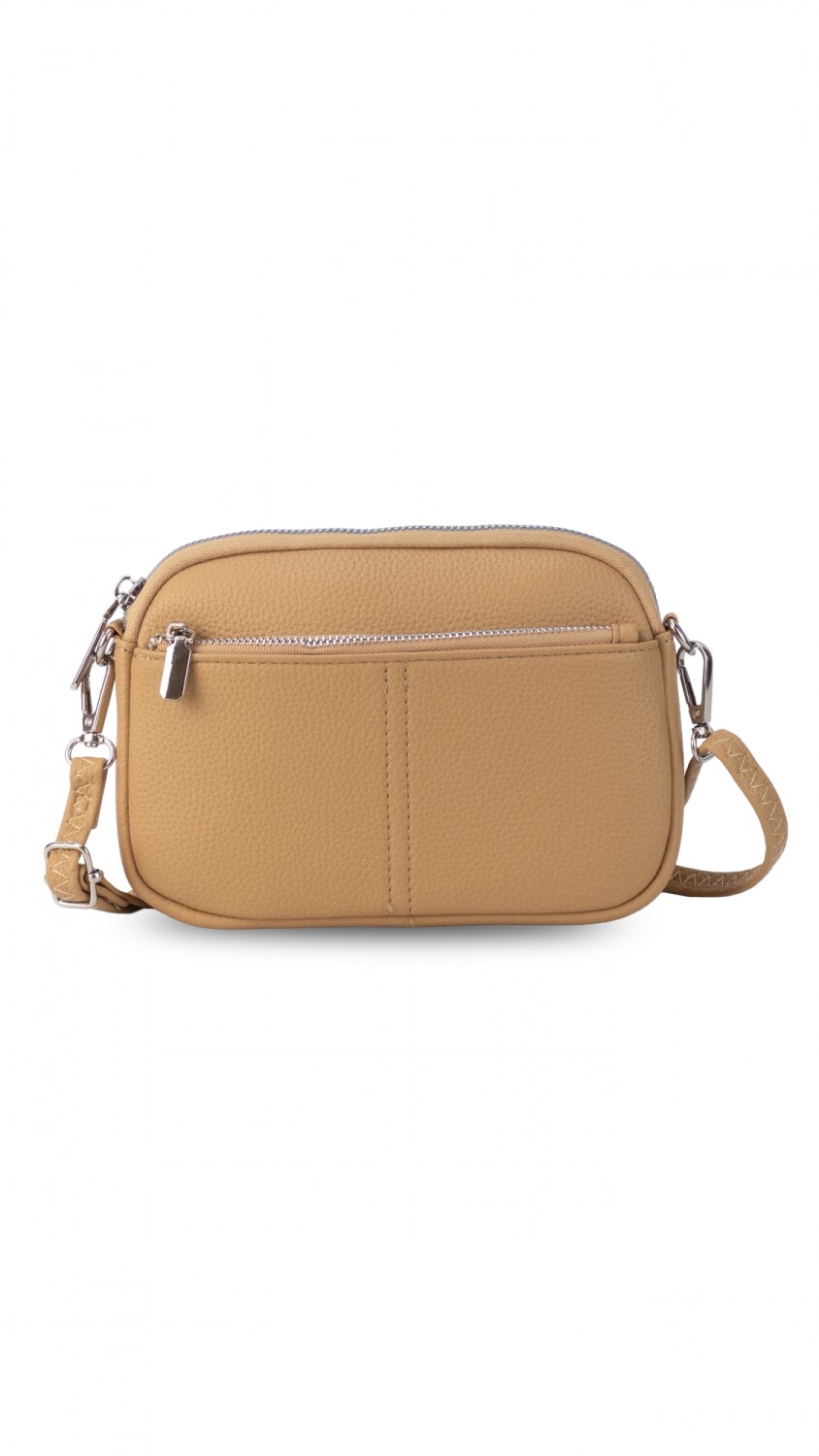 Bandolera pequeña y compacta en símil cuero, con correa fina ajustable del mismo material. Cuenta con bolsillo interno del mismo forro en seda y dos compartimientos con cierre.