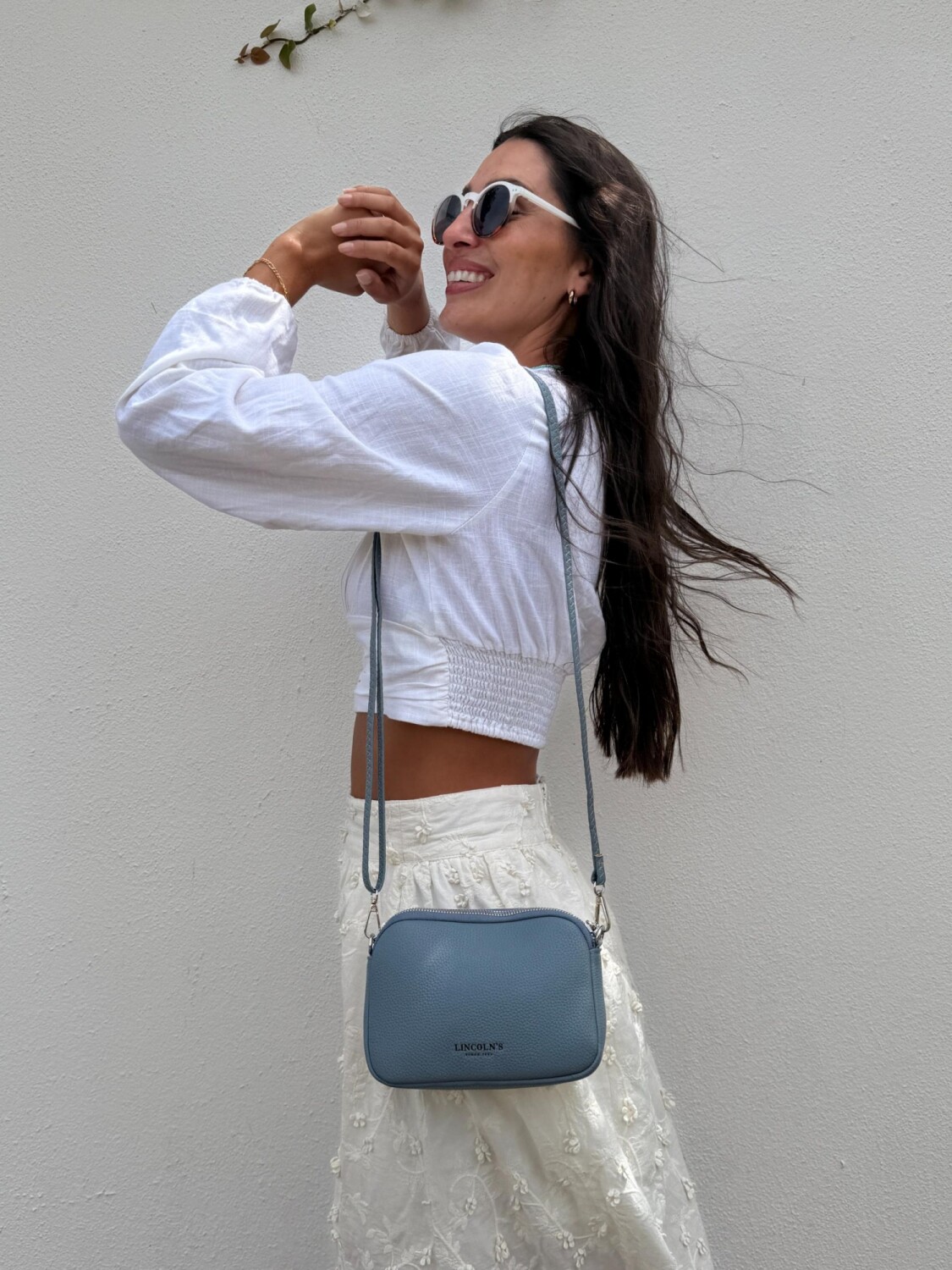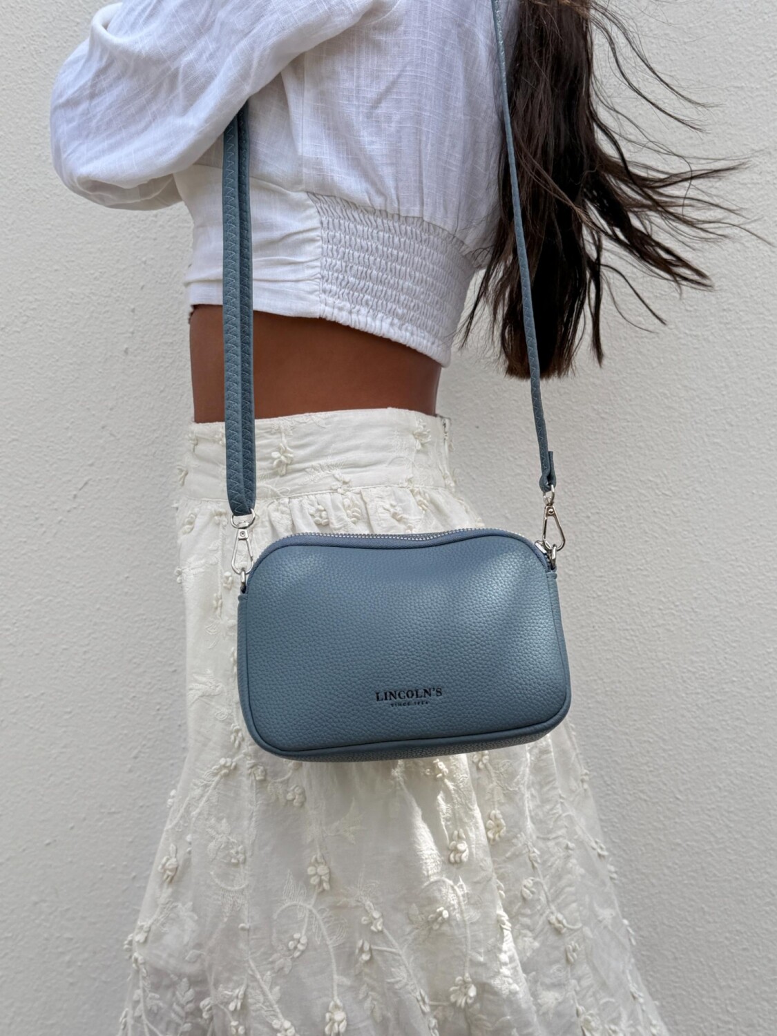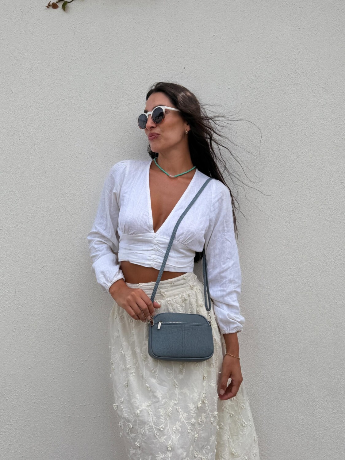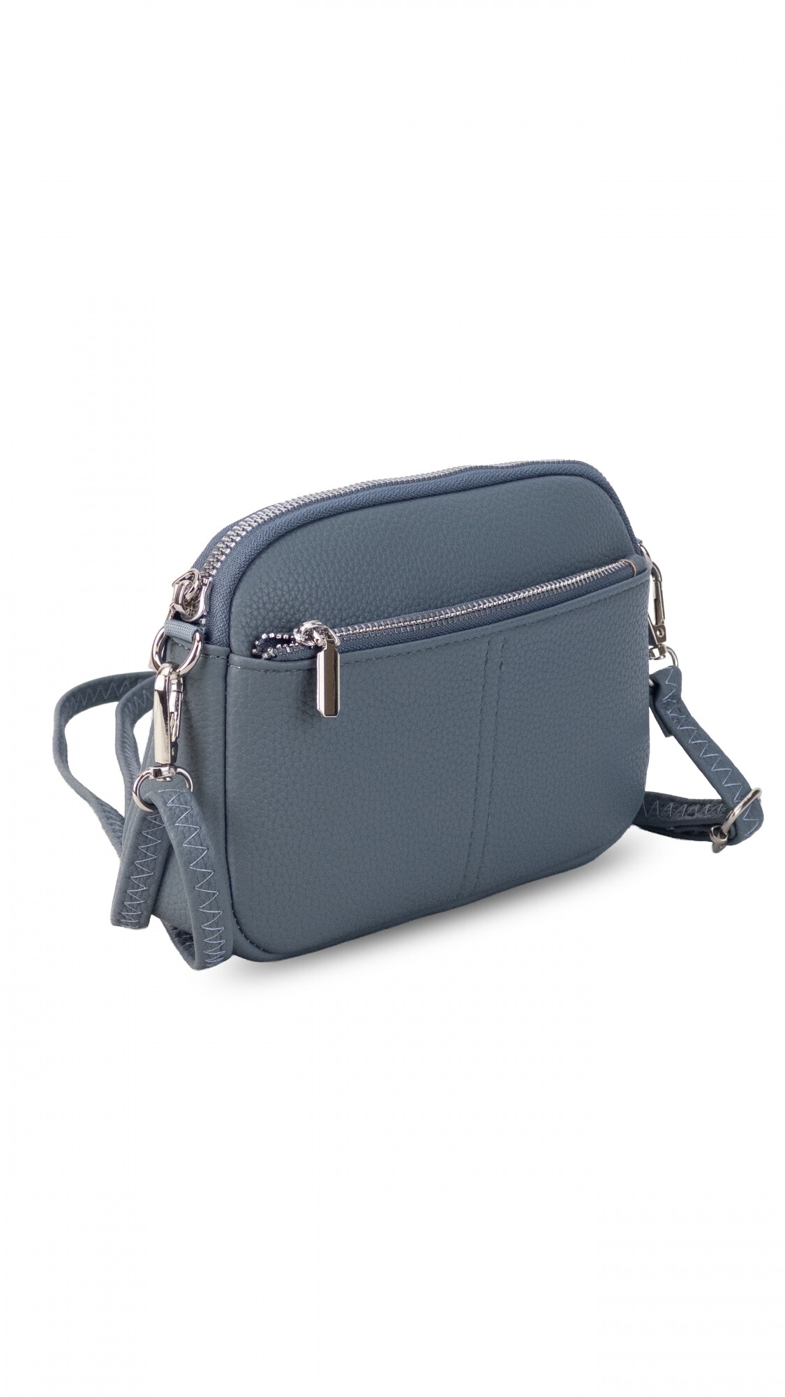 Bandolera pequeña y compacta en símil cuero, con correa fina ajustable del mismo material. Cuenta con bolsillo interno del mismo forro en seda y dos compartimientos con cierre.