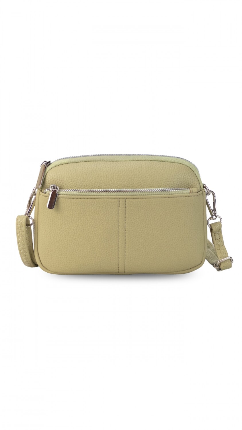 Bandolera pequeña y compacta en símil cuero, con correa fina ajustable del mismo material. Cuenta con bolsillo interno del mismo forro en seda y dos compartimientos con cierre.