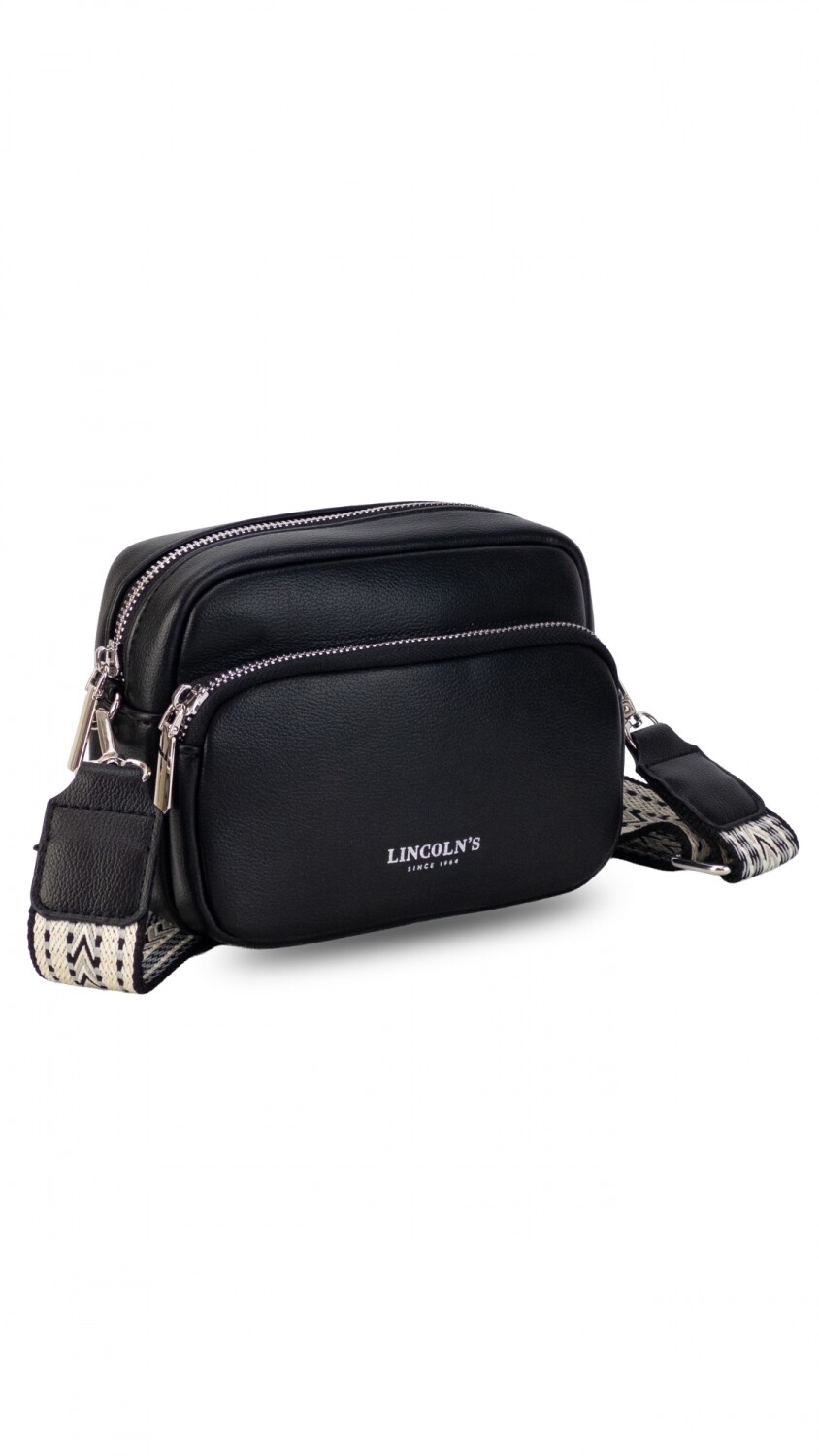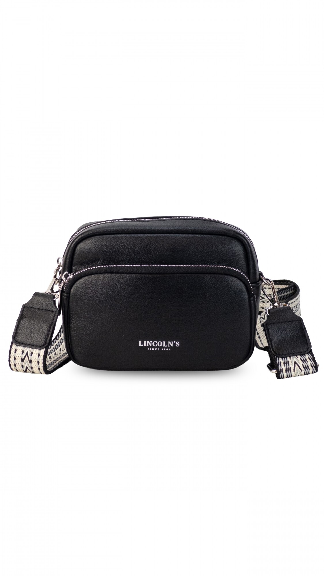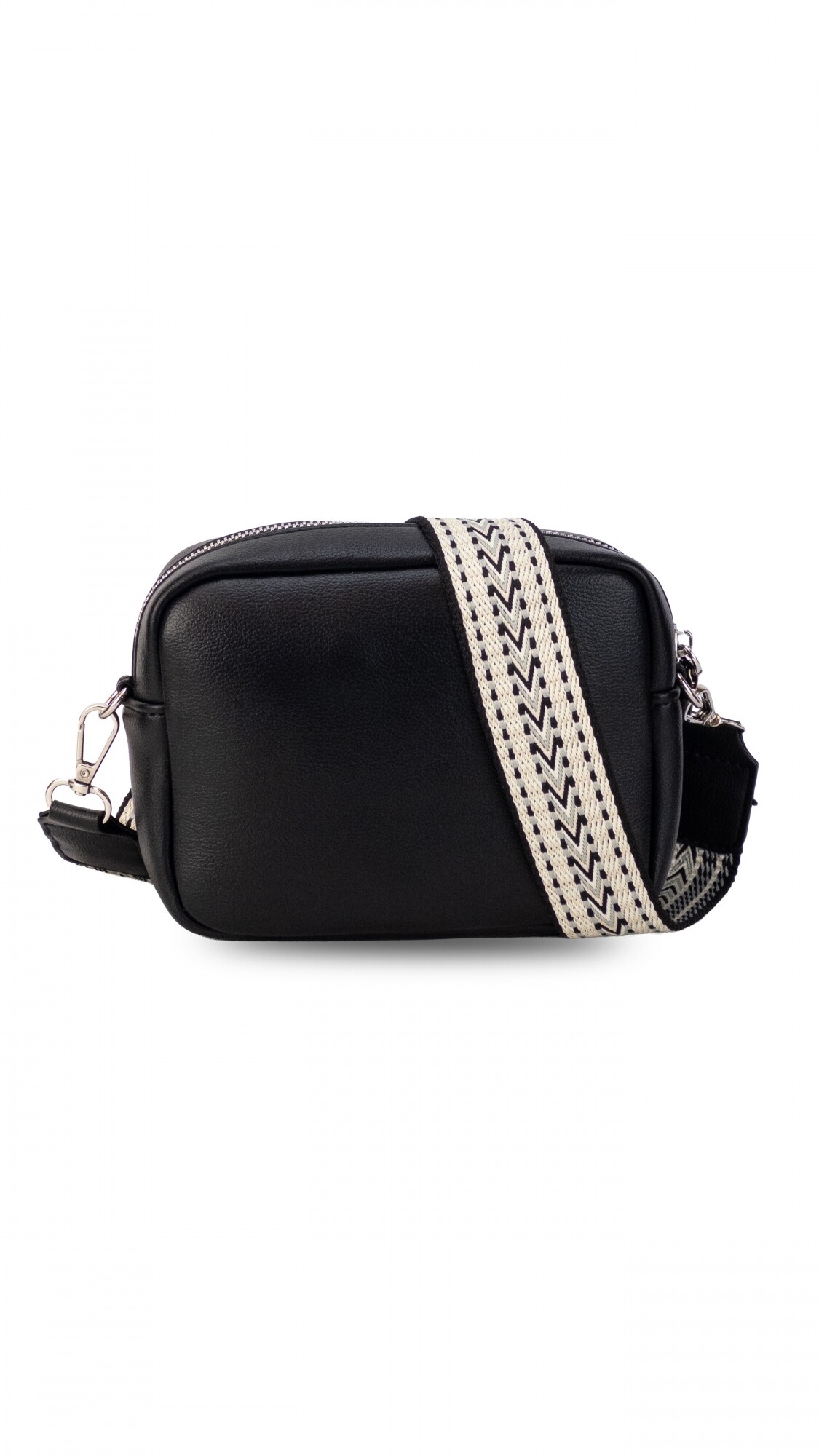 Bandolera en símil cuero de acabado suave y resistente. Diseño compacto con dos reparticiones con cierre y correa ajustable en galón estampado que aporta un toque moderno.