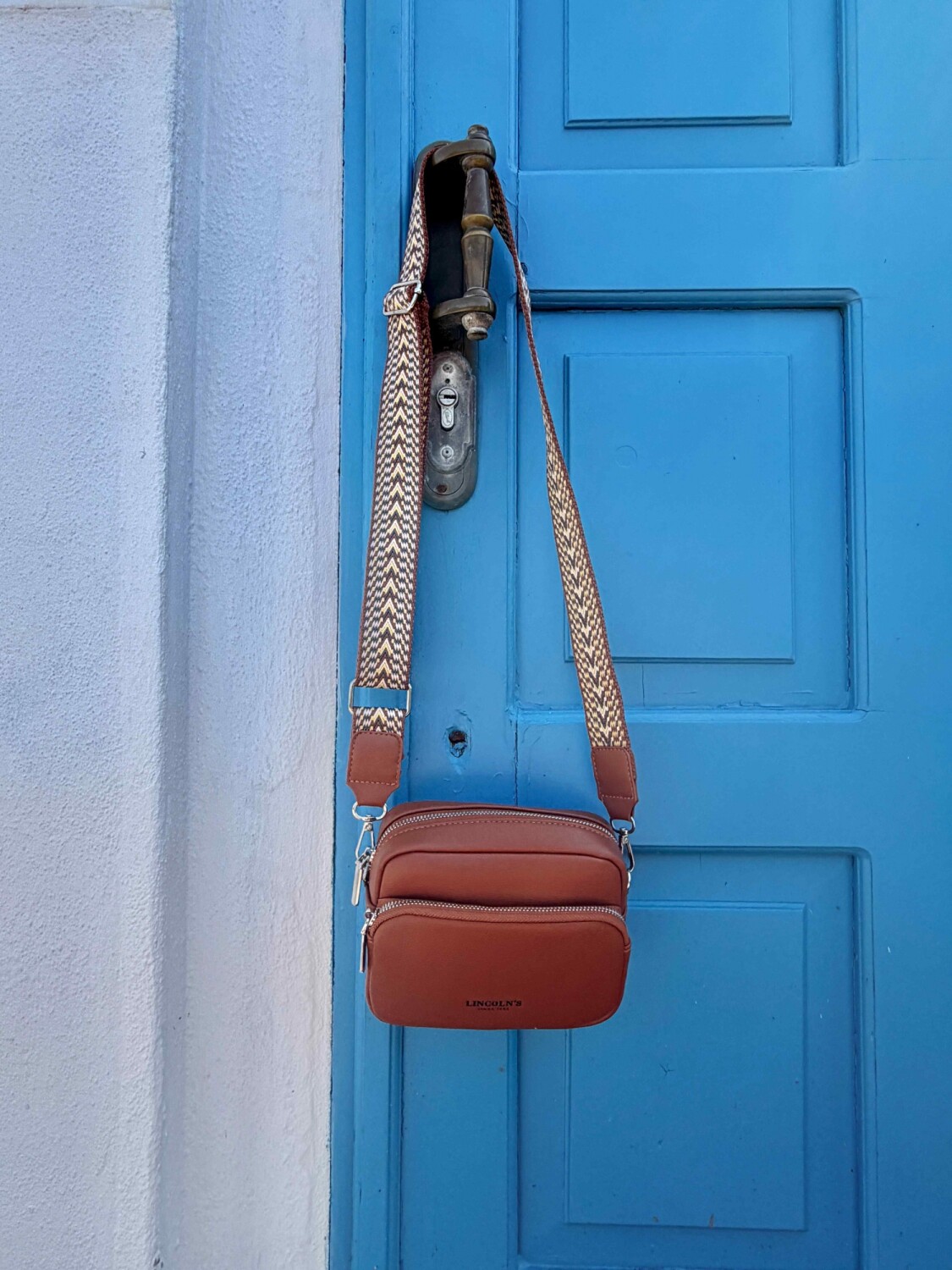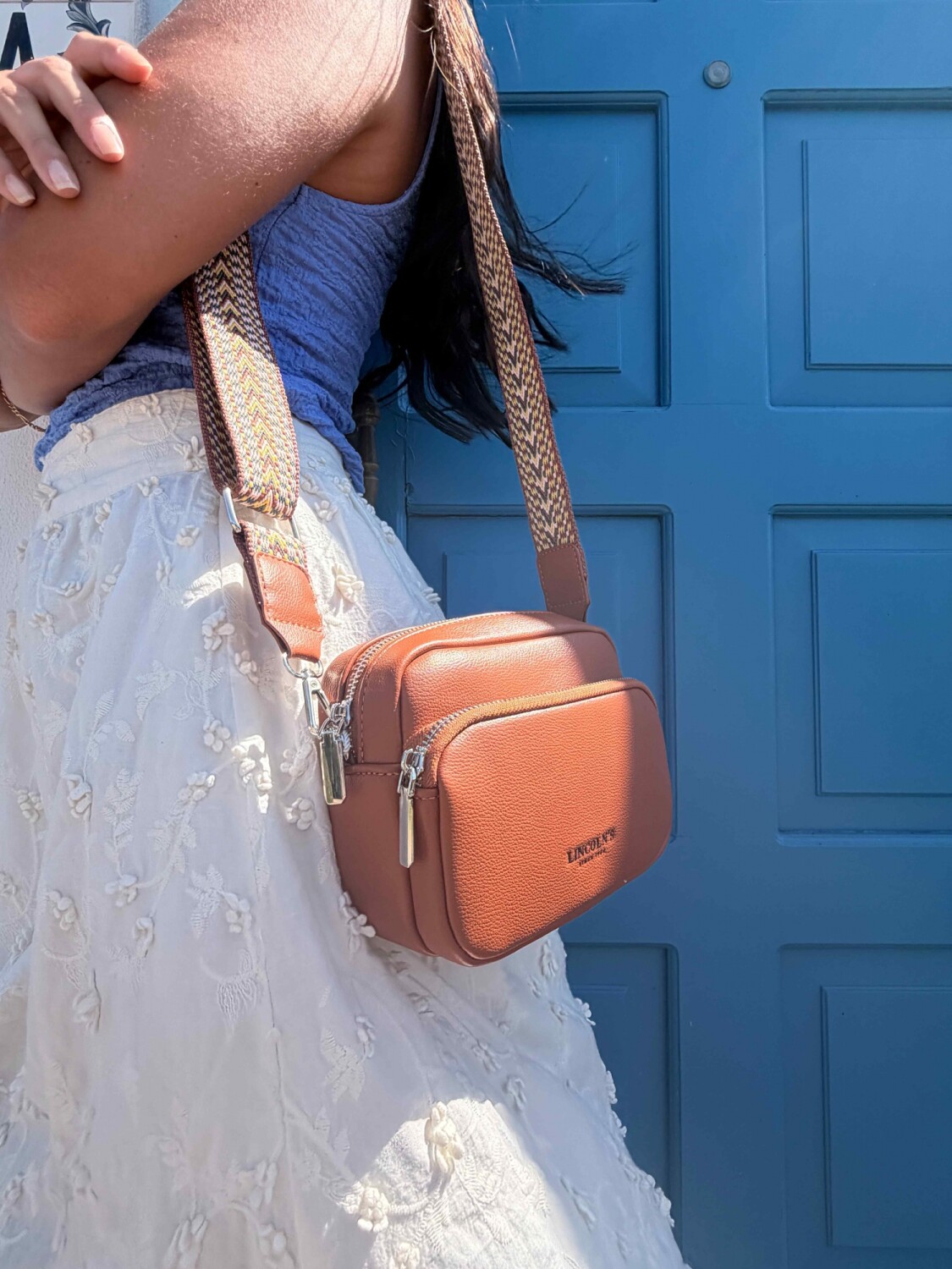 Bandolera en símil cuero de acabado suave y resistente. Diseño compacto con dos reparticiones con cierre y correa ajustable en galón estampado que aporta un toque moderno.