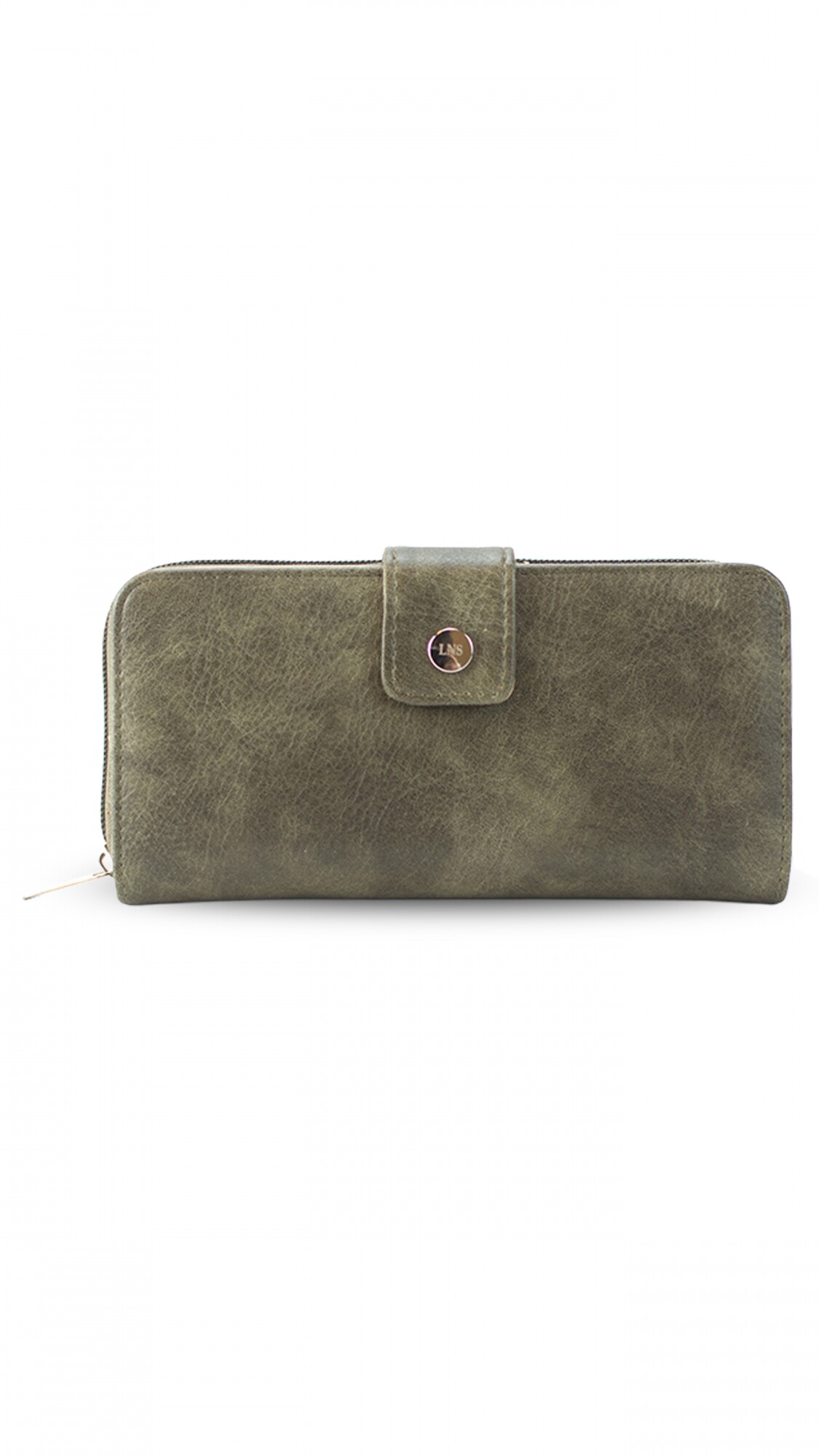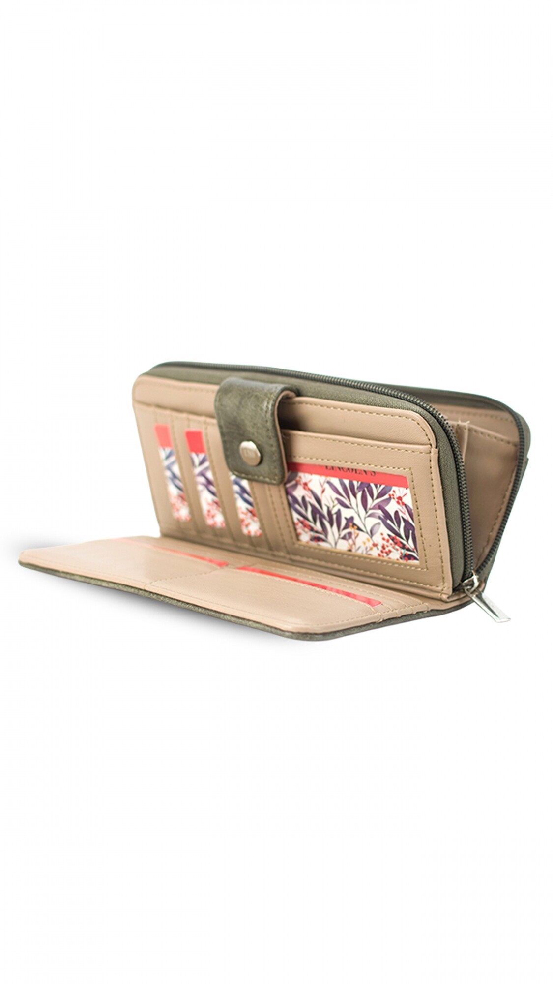 Billetera larga con presilla y repartición con cierre. Compartimento frontal con tarjeteros, visor y bolsillos. Compartimento posterior incluye monedero con cierre, tarjeteros y bolsillos. Bolsillo atrás.