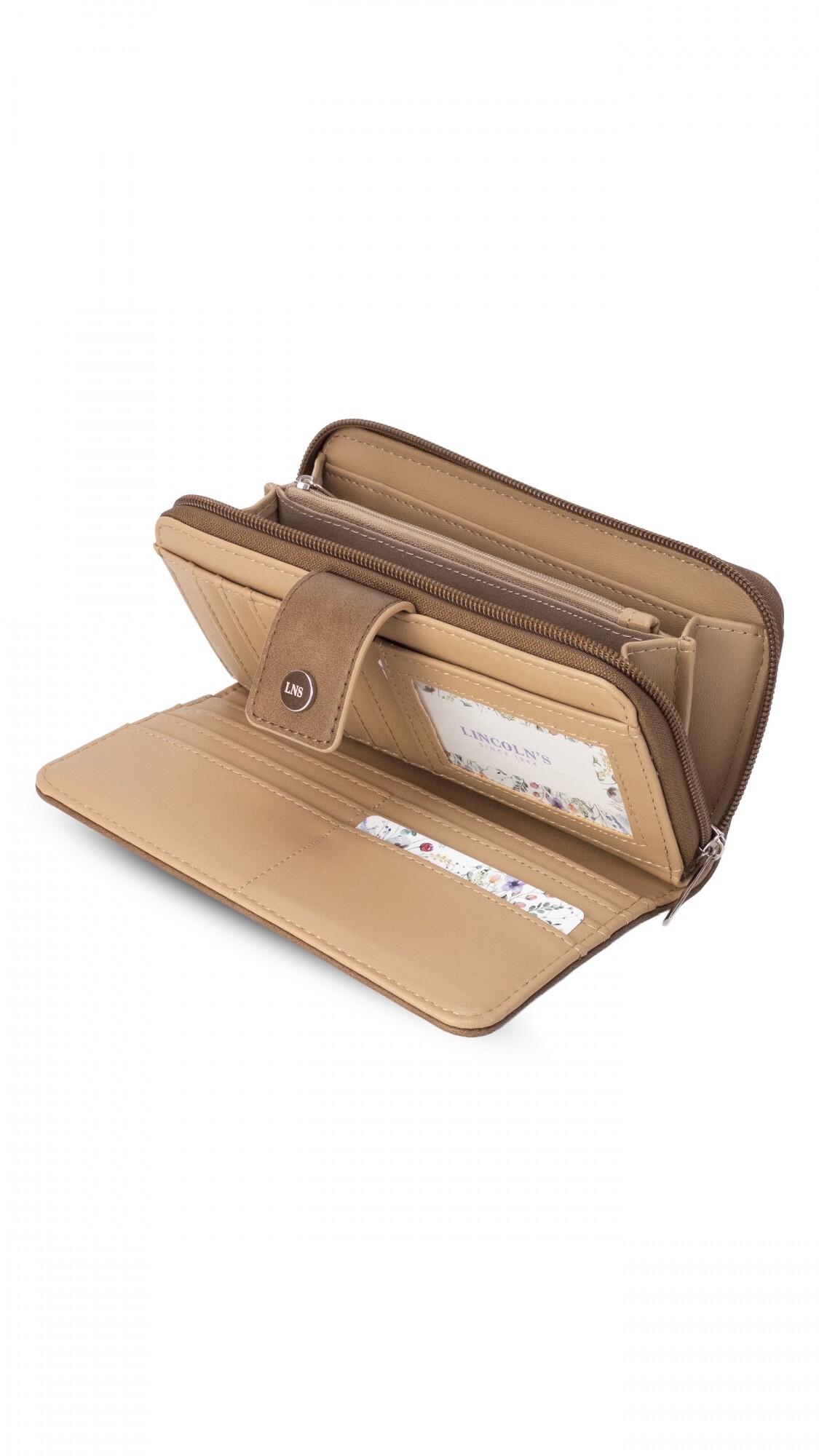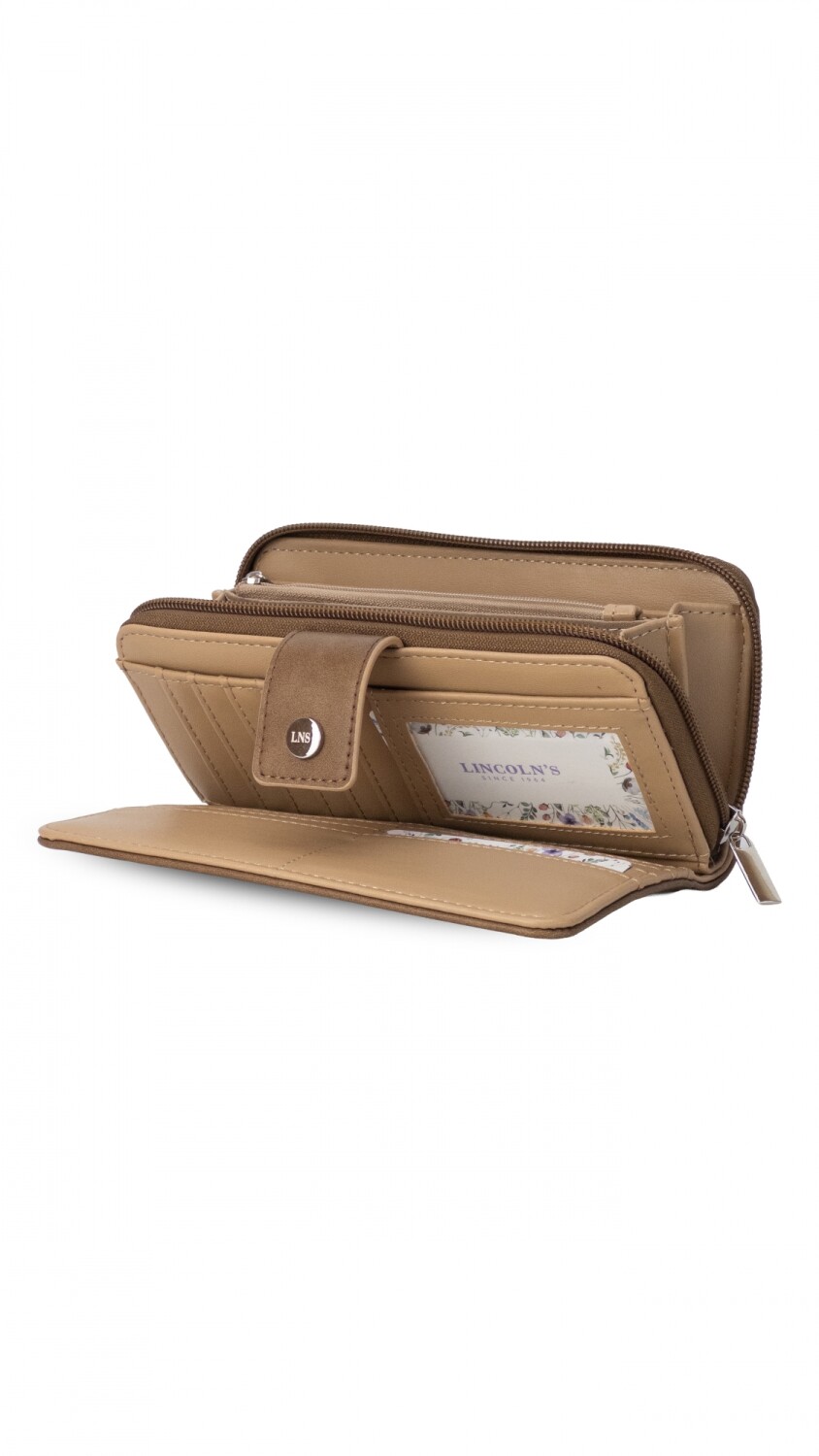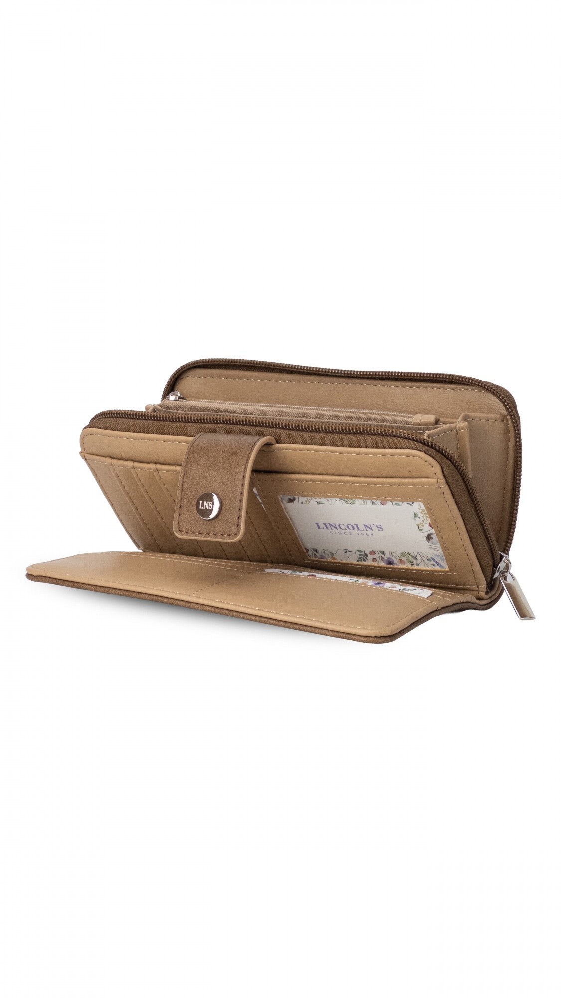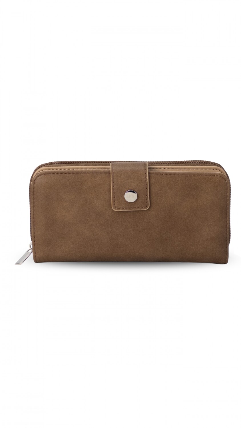 Billetera larga con presilla y repartición con cierre. Compartimento frontal con tarjeteros, visor y bolsillos. Compartimento posterior incluye monedero con cierre, tarjeteros y bolsillos. Bolsillo atrás.