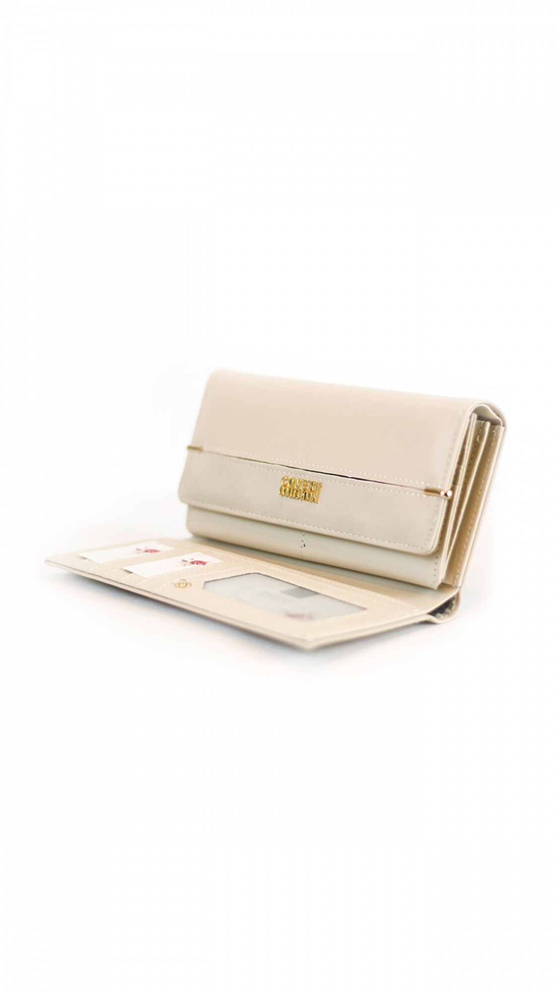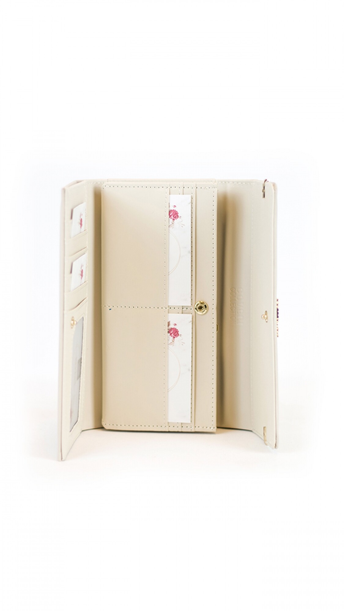 Billetera larga con broche a presión. Interior tipo abanico con tres reparticiones, visor, tarjeteros, bolsillos internos y bolsillo con cierre.