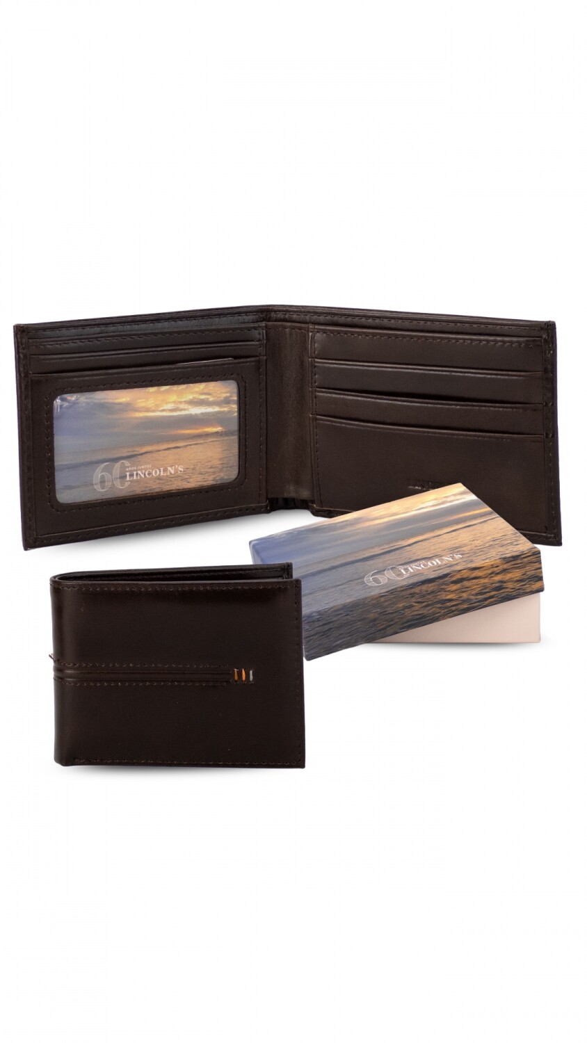 Billetera en cuero. Interior con visor, tarjeteros y doble repartición para billetes.