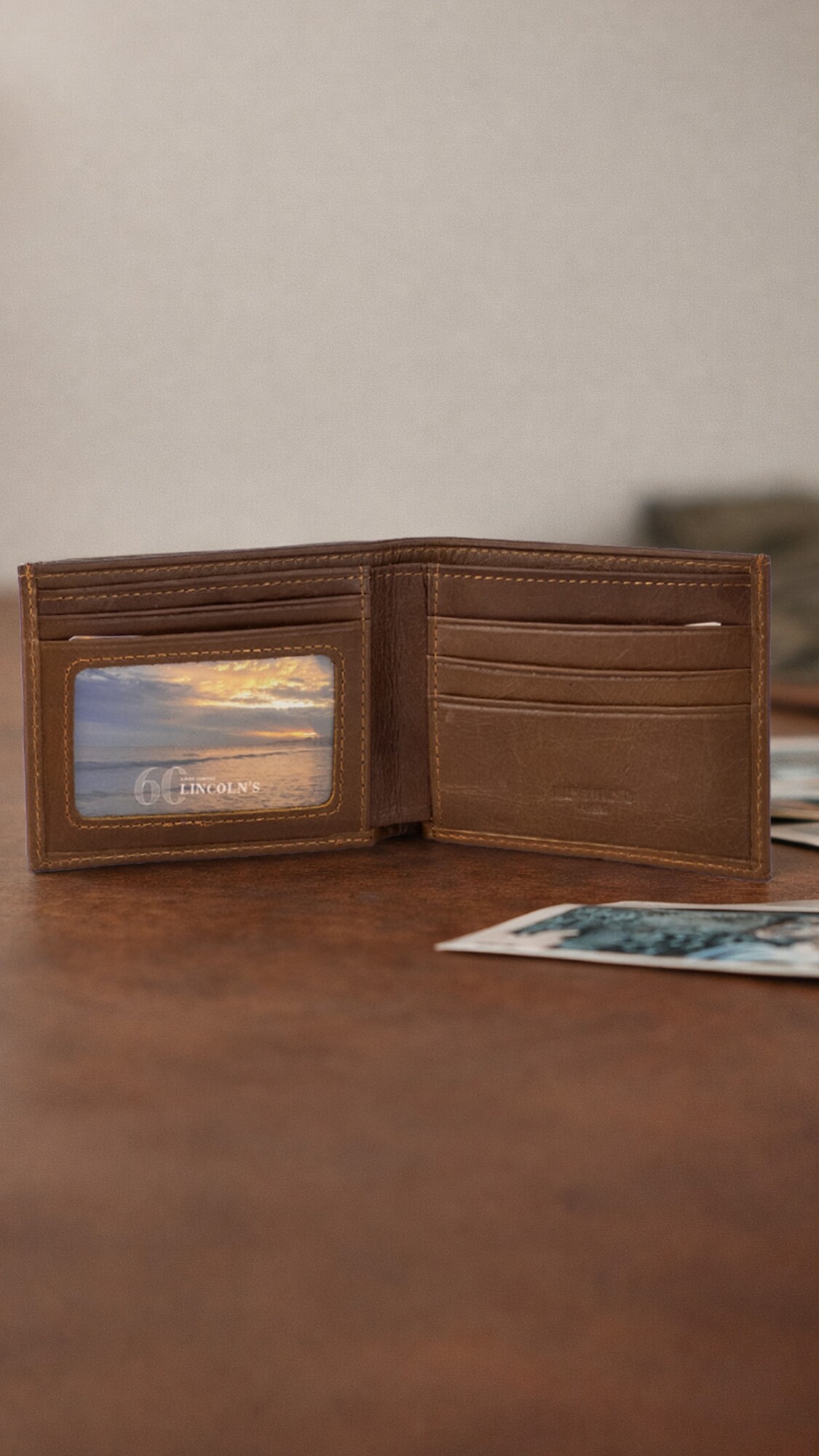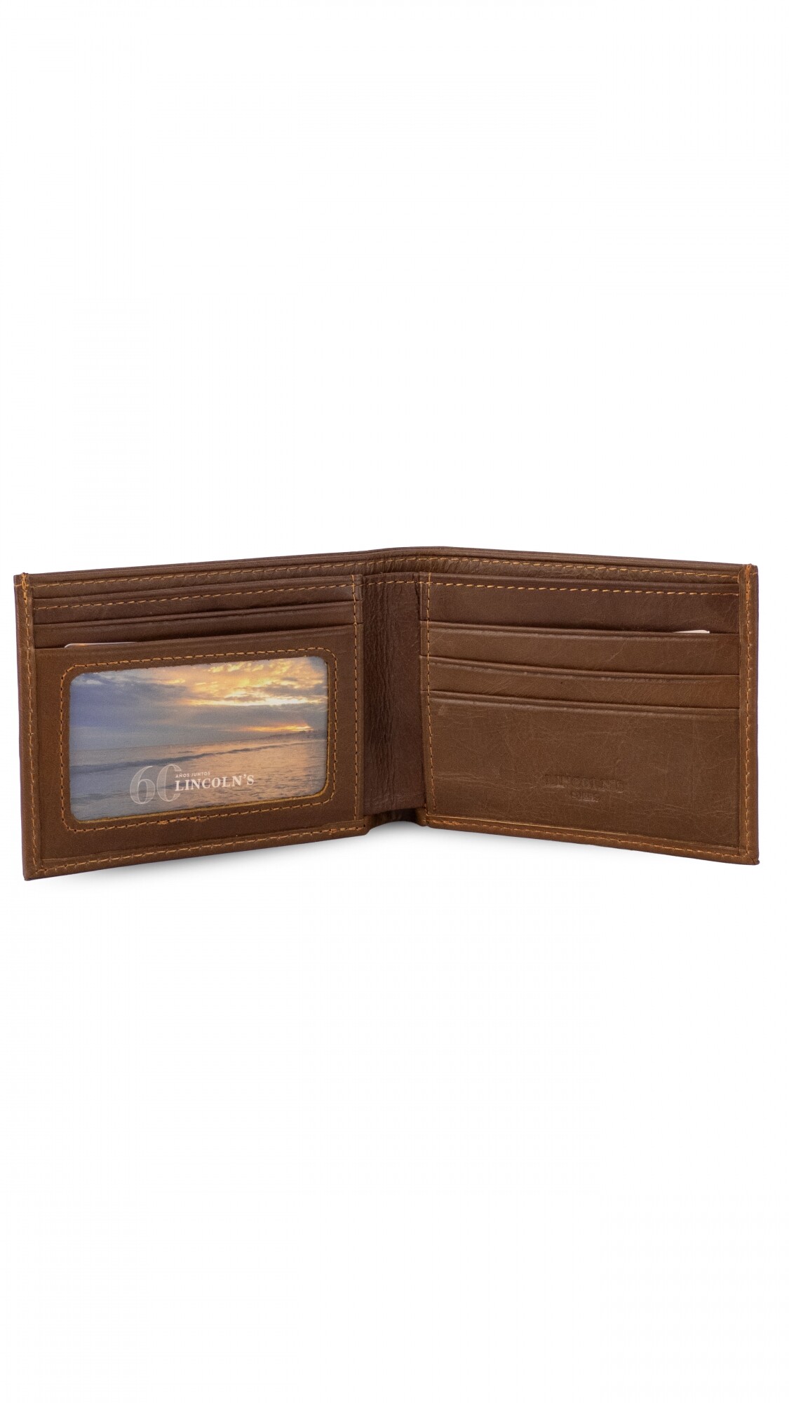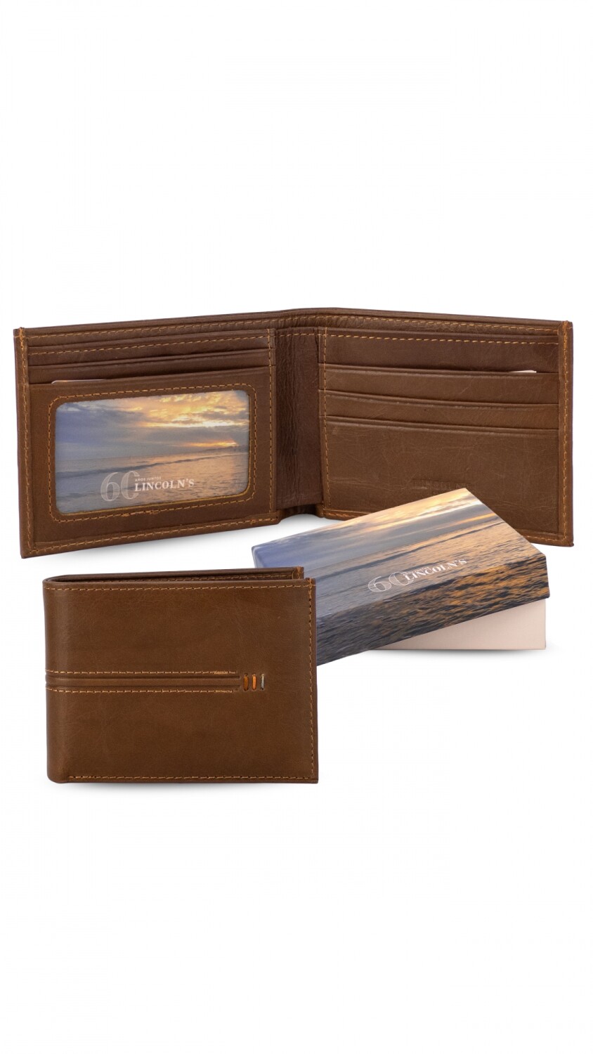 Billetera en cuero. Interior con visor, tarjeteros y doble repartición para billetes.