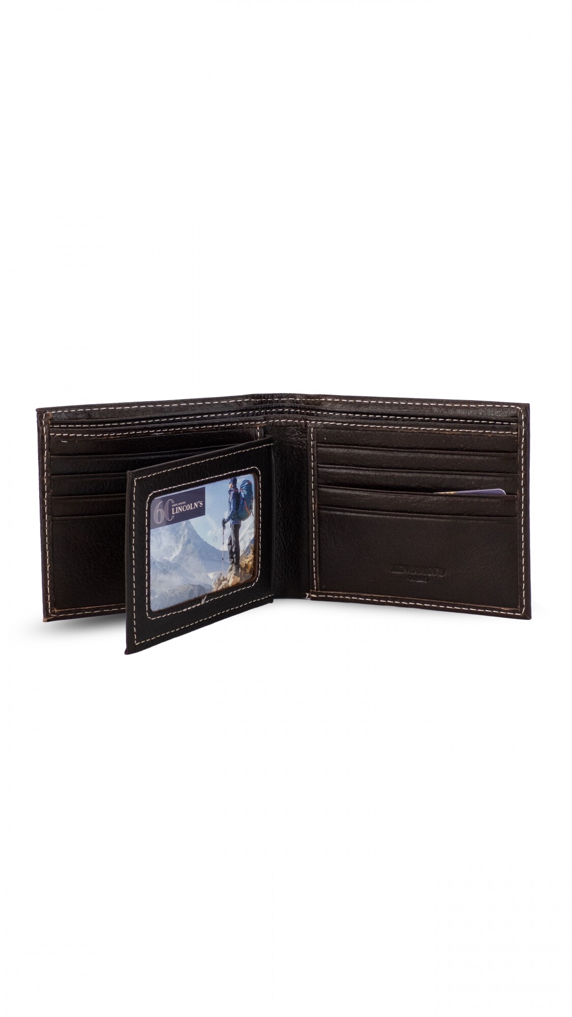 Billetera en cuero lisa con visor interior para tarjetas. Lugar para 12 tarjetas. Interior con repartición para billetes con cierre interno.
