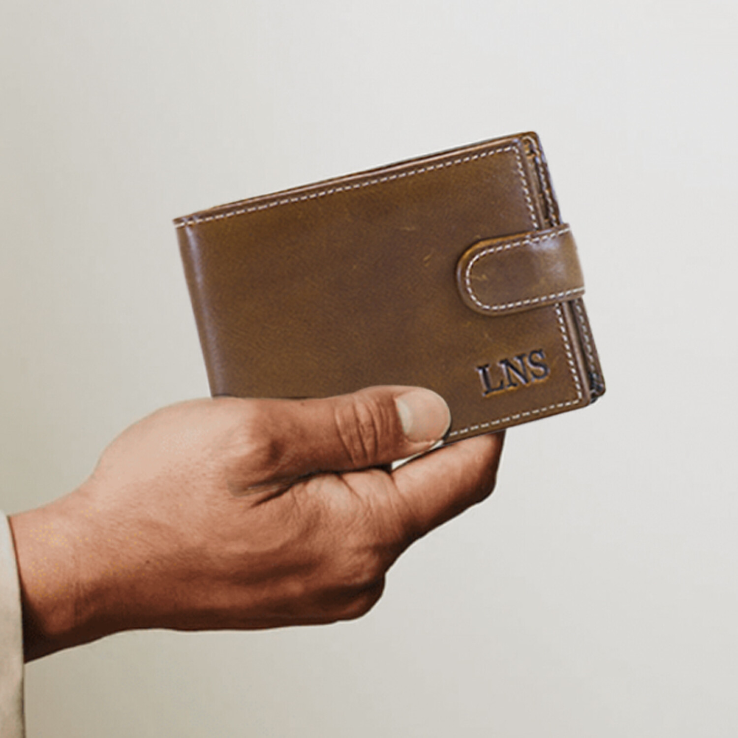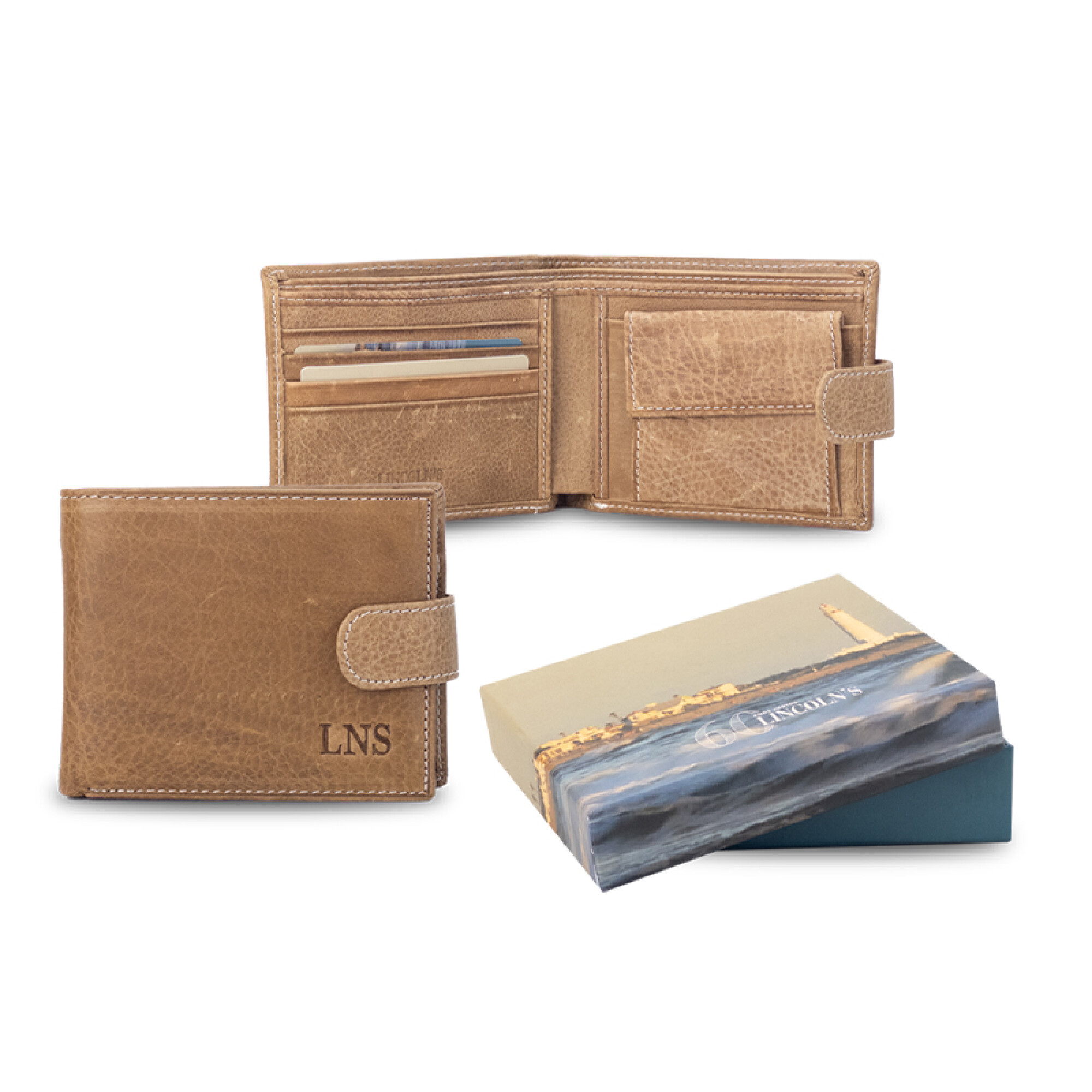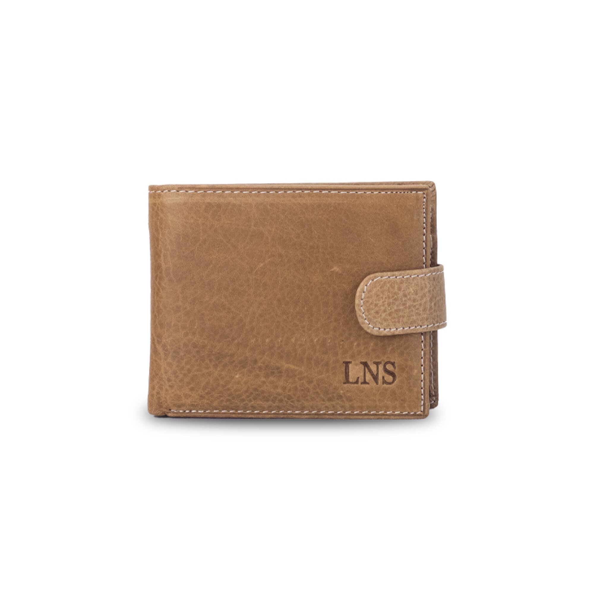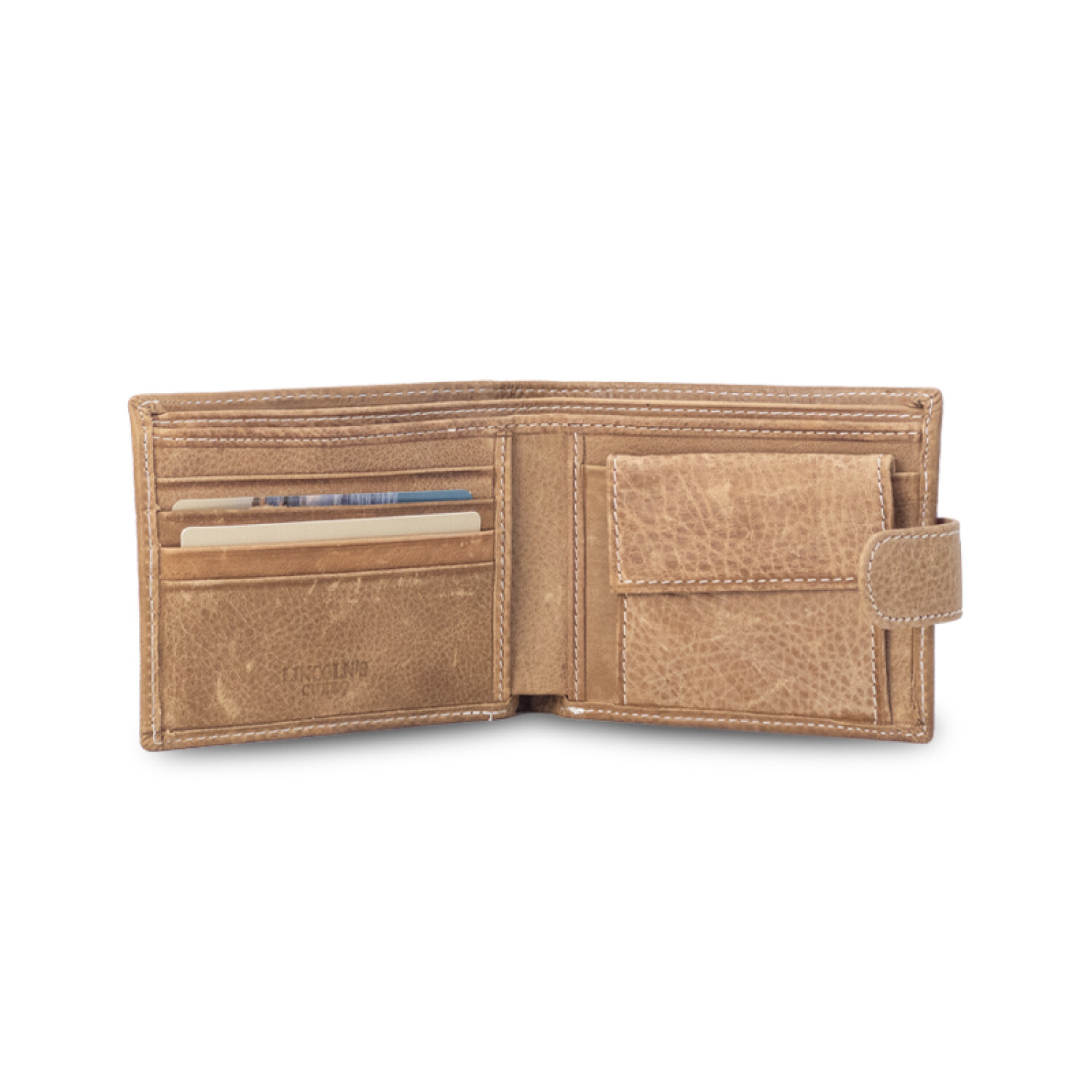 Billetera en cuero con presilla. Interior con visor, tarjeteros, bolsillo y doble repartición para billetes.