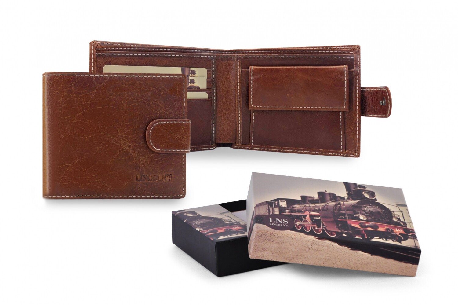 Billetera en cuero con presilla. Interior con visor, tarjeteros, bolsillo y doble repartición para billetes.