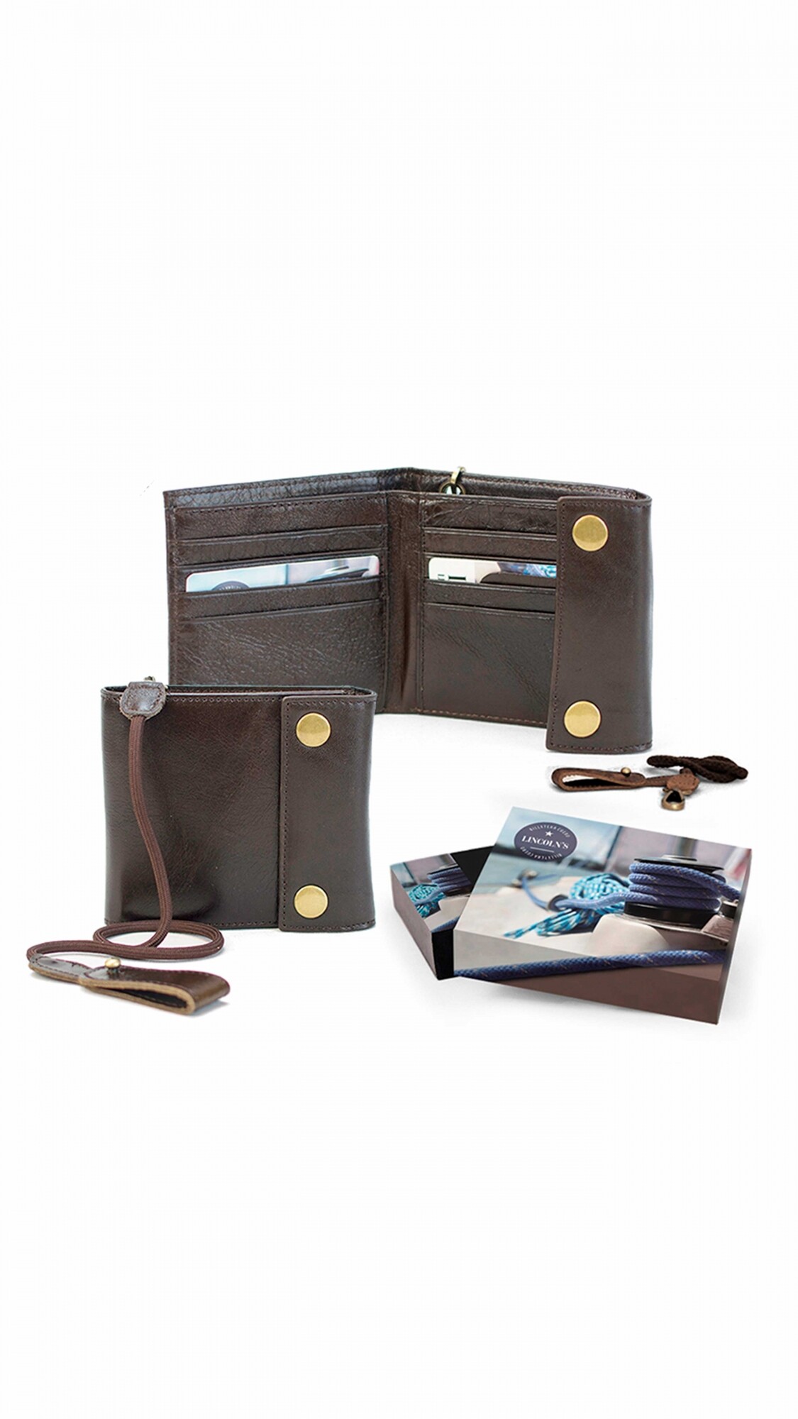 Billetera cuero con tapa doble broche. Correa con presilla para cinturón