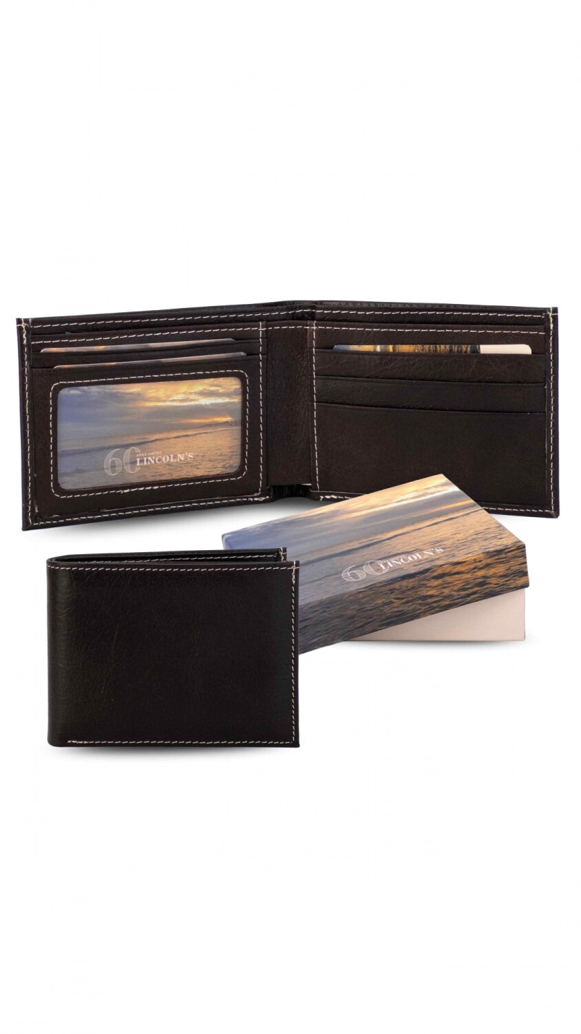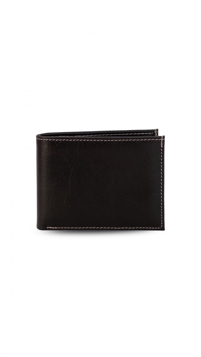 Billetera en cuero. Interior con visor, tarjeteros y doble repartición para billetes.